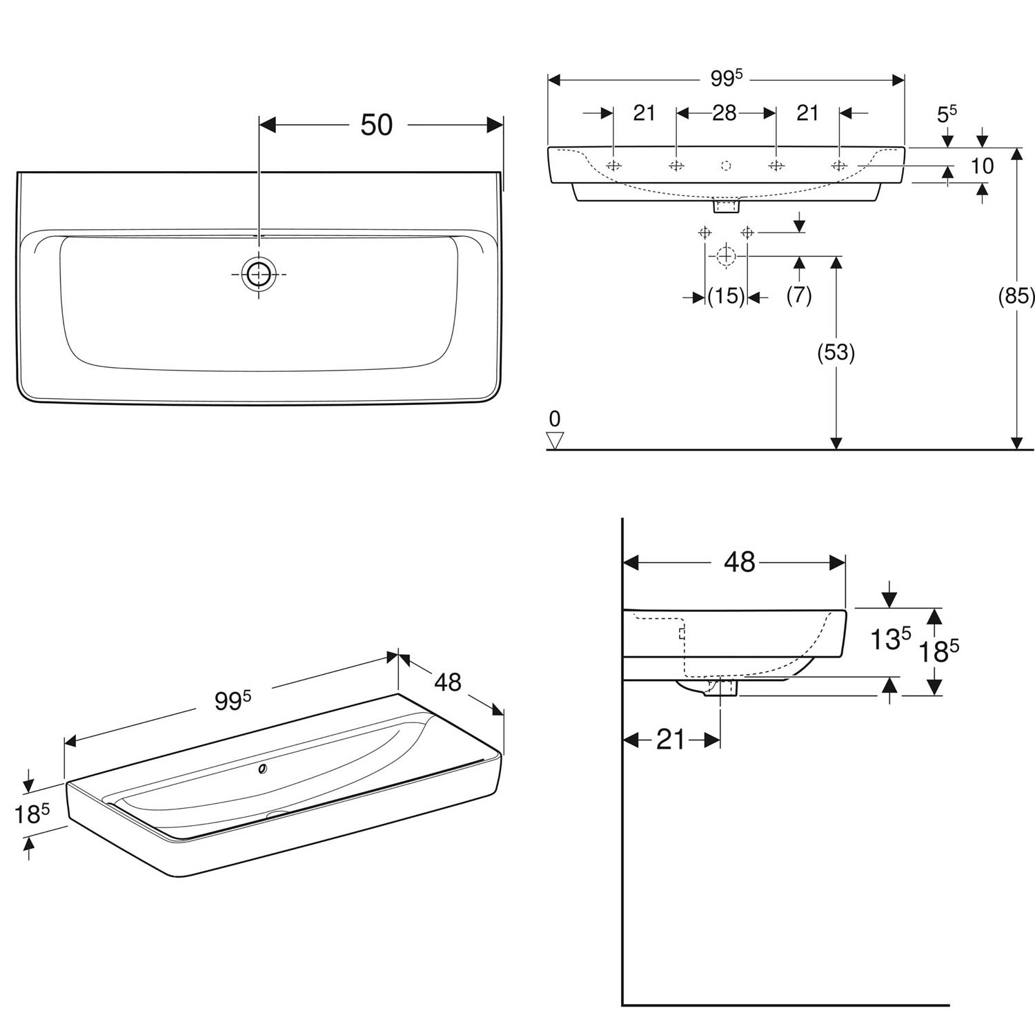 Geberit Renova Plan Waschtisch 100 cm, ohne Hahnloch, mit Überlauf