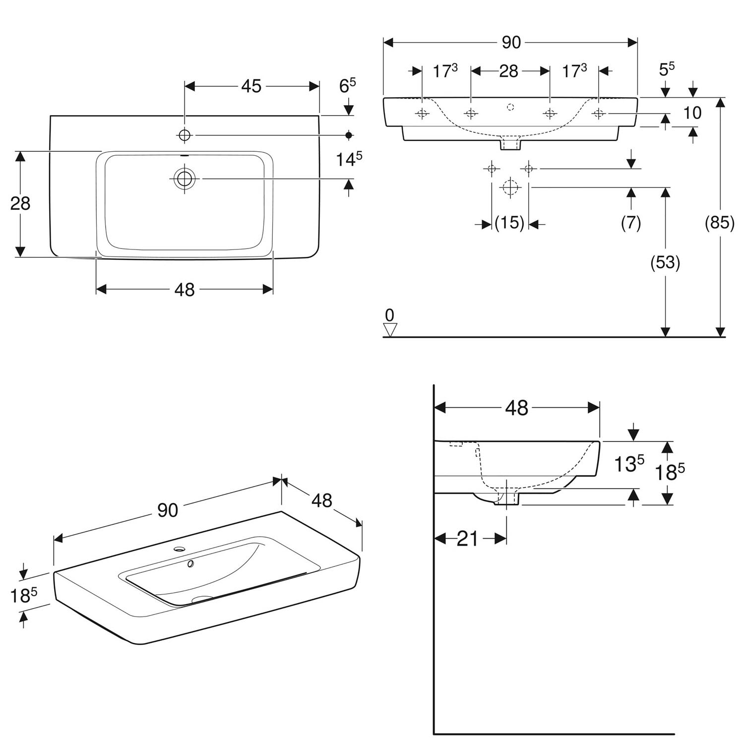 Geberit Renova Plan Waschtisch 90 cm mit Ablagefläche, mit 1 Hahnloch, mit Überlauf