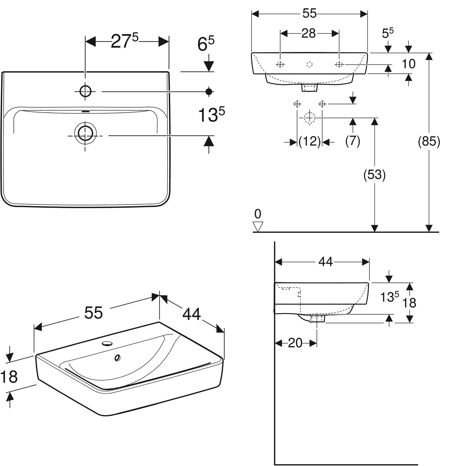 Geberit Renova Plan Aufsatzwaschtisch 55 cm, mit 1 Hahnloch, mit Überlauf