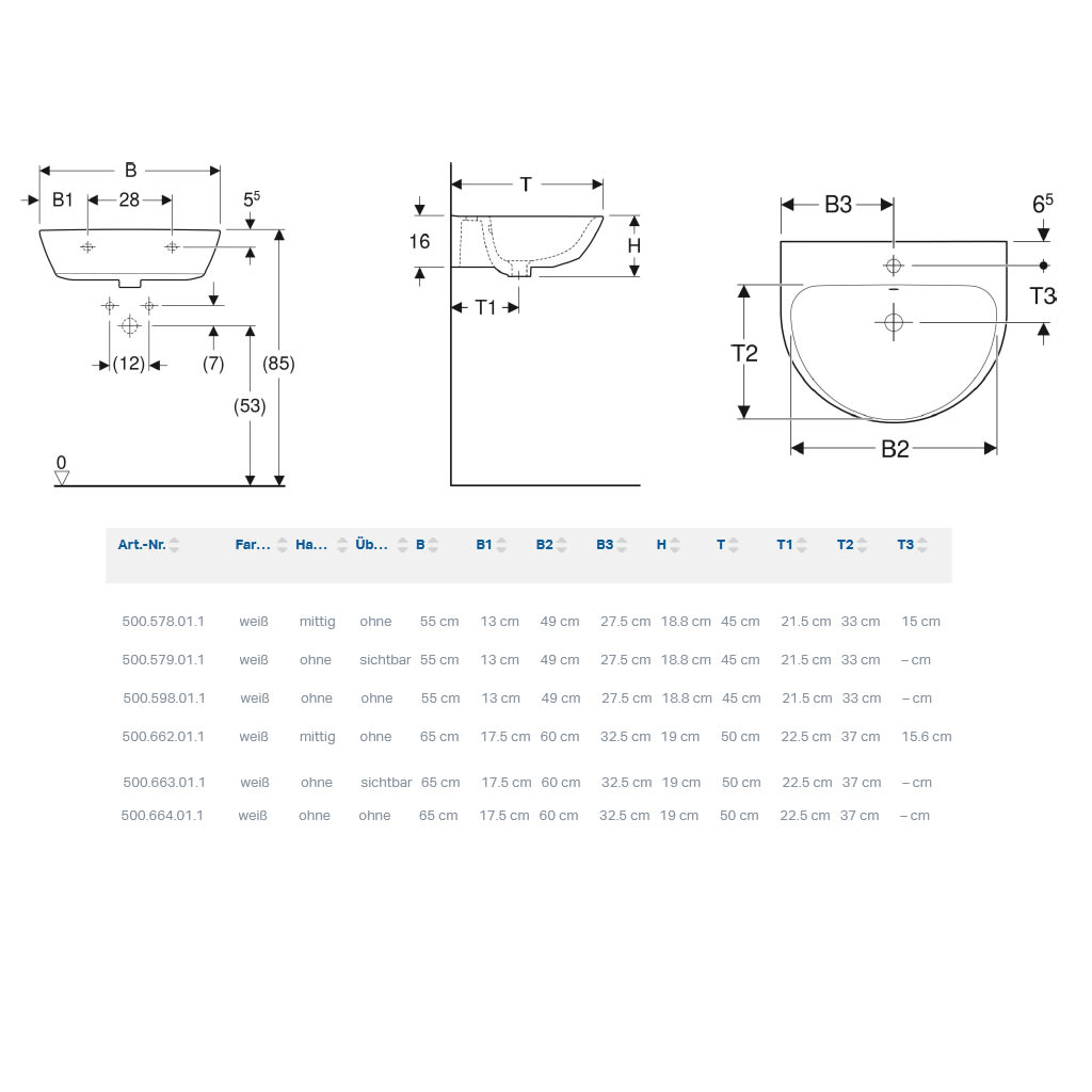 Geberit Renova Waschtisch 65 x 50 cm ohne Hahnloch ohne Überlauf
