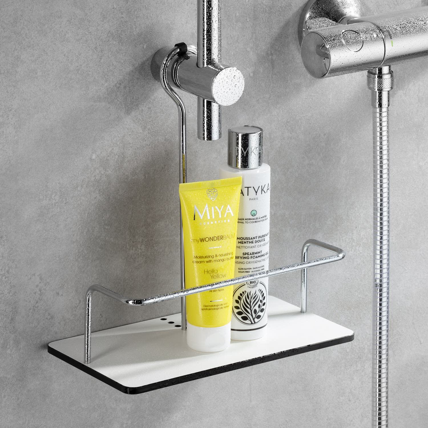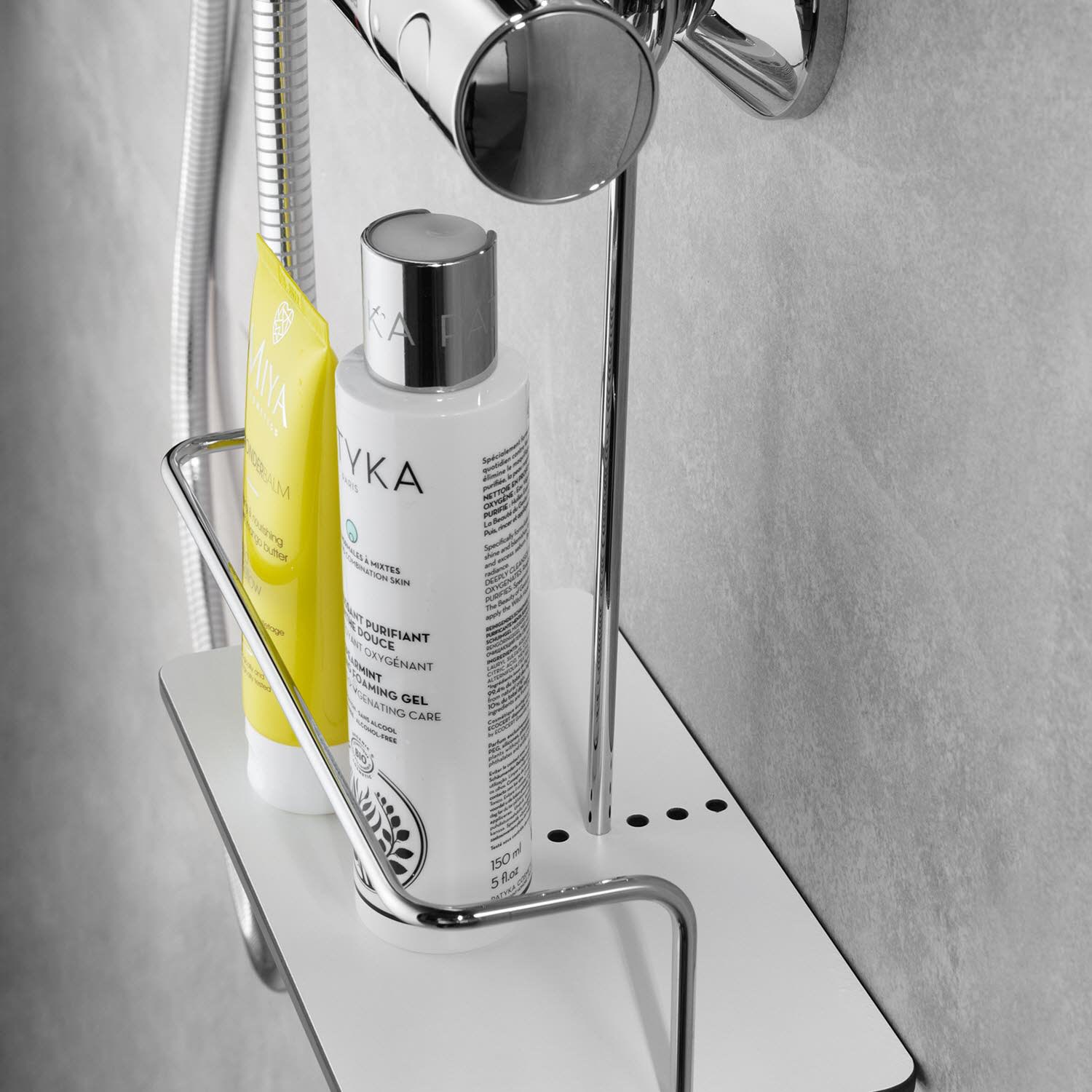 - zum Einhängen an der Aufputz-Duscharmatur oder Brausestange