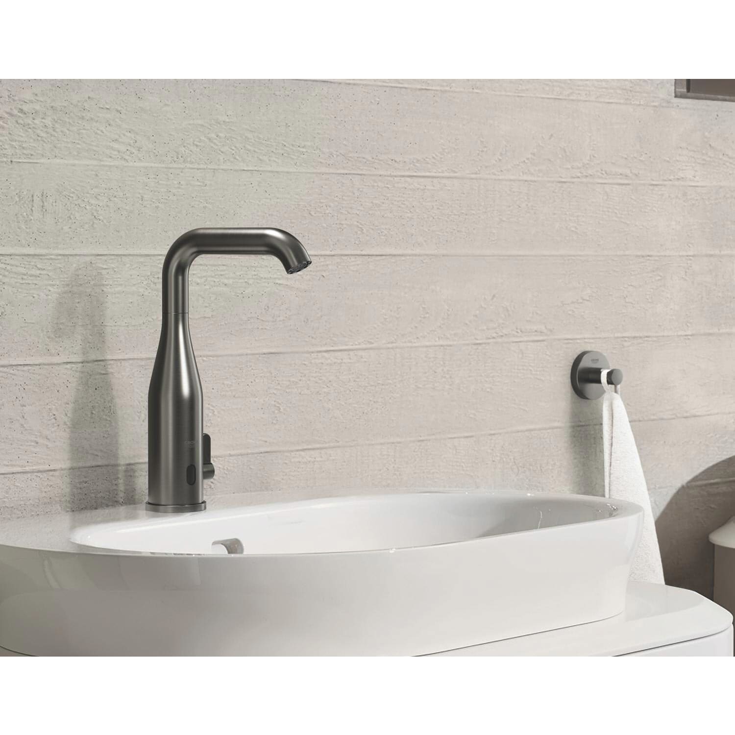Hinter dem schlanken, organischen Design verbirgt sich die innovative Technologie von GROHE, die mehr Komfort und höchste Effizienz bei der Körperpflege bietet. Der markante Zylinder und der elegant gebogene Auslauf der GROHE Essence E Waschtischarmatur sind echte Hingucker. Und dank der Infrarotfunktion ist das Design superschlank und puristisch, da kein Hebel benötigt wird. Der Sensor erkennt Handbewegungen, sodass Wasser nur bei Bedarf fließt. Dies garantiert Freude bei der Körperpflege und gleichzeitig Wasserersparnis– ideal für das heimische Badezimmer oder stark frequentierte öffentliche Räume. Der Laminarmousseur sorgt für einen kristallklaren, spritzfreien Wasserstrom und begrenzt zudem den Wasserfluss auf umweltfreundliche 5,0 l/min. Die Temperatur lässt sich mühelos mit einem kleinen Hebel an der Armaturenseite einstellen und mit einem kleinen im Lieferumfang enthaltenen Zubehörteil auf einen Höchstwert festlegen. Das spart nicht nur Energie, sondern reduziert auch die Verbrühungsgefahr. Der Schwenkbereich des praktischen hohen Auslaufs ist auf 0°, 150° oder 360° einstellbar. Für die besonders robuste GROHE StarLight Beschichtung wird das PVD-Verfahren (physikalische Gasphasenabscheidung) verwendet– für eine zehn Mal höhere Kratzfestigkeit als bei herkömmlichen Chromoberflächen. Außerdem ist die Armatur aufgrund des geringen Hautkontakts besonders hygienisch und schnell zu reinigen.