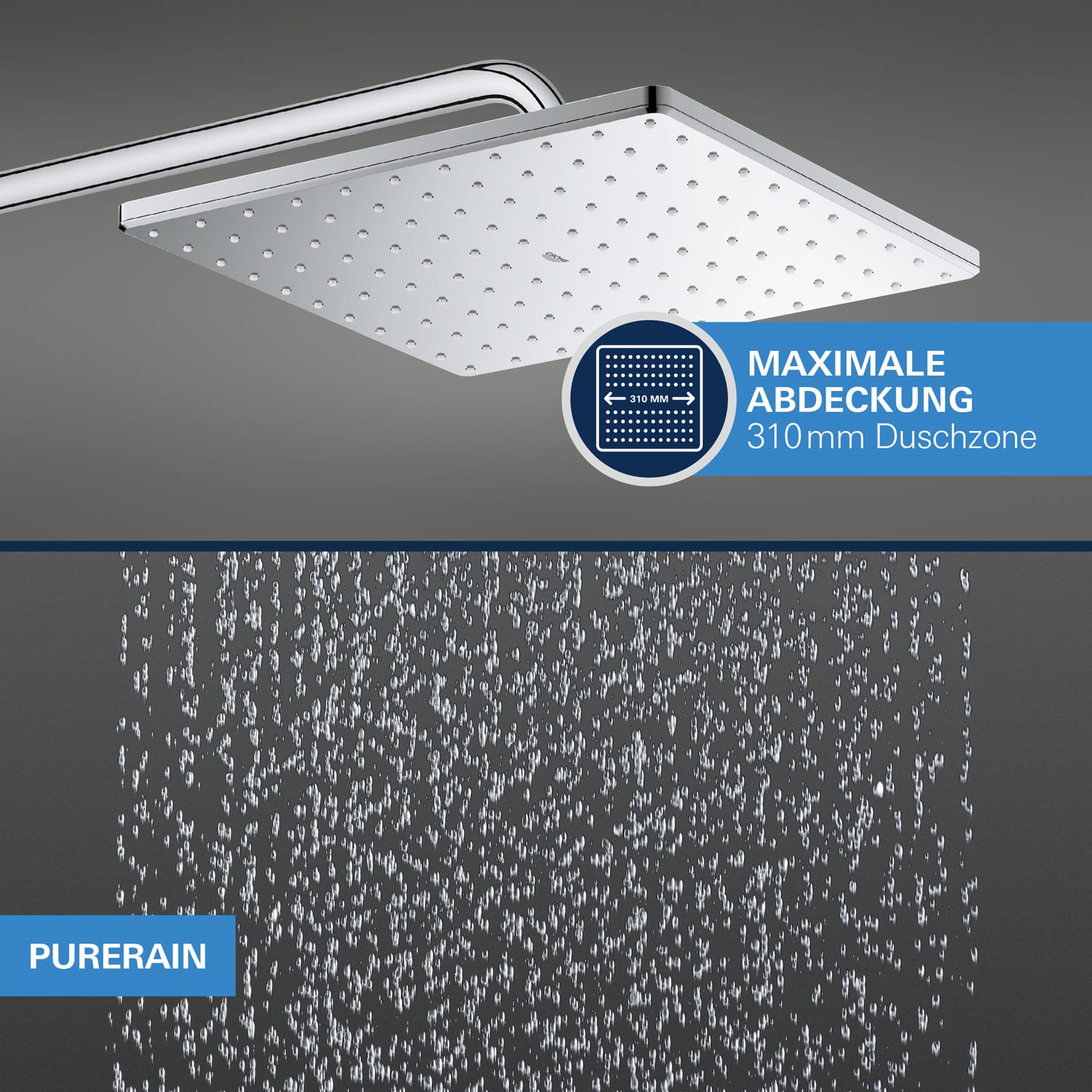 Der großzügige Brausekopf mit PureRain Strahl verwandelt Ihr Bad in eine Wohlfühloase – für Entspannung wie unter freiem Himmel.