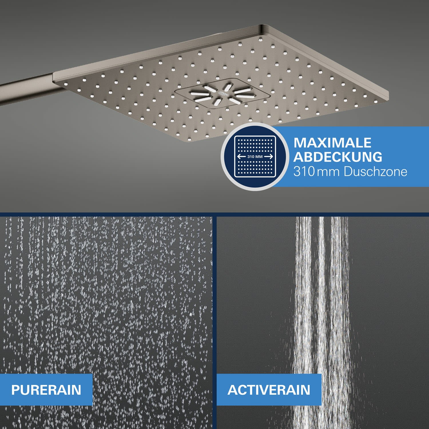 Das Set verfügt über alle Funktionen und Leistungen für eine perfekte Dusche, zwei Strahlbilder, die separat oder sogar in Kombination miteinander verwendet werden können. Zum einen den GROHE PureRain Strahl, der Sie wie ein sanfter Regen sanft einhüllt und zum anderen das neue GROHE ActiveRain Strahlmuster.