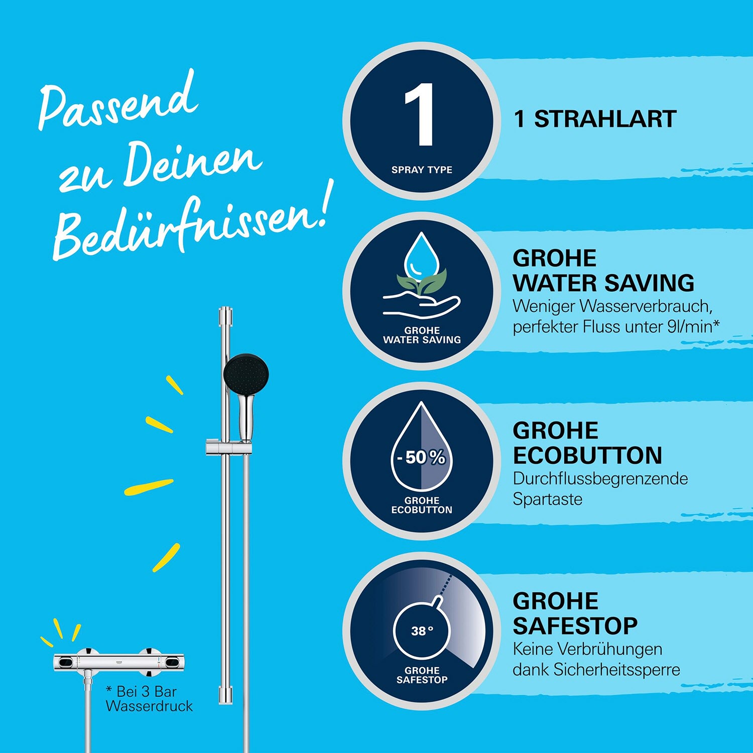 - GROHE SafeStop Taste ist auf 38 °C eingestellt zum Schutz vor Verbrühungen