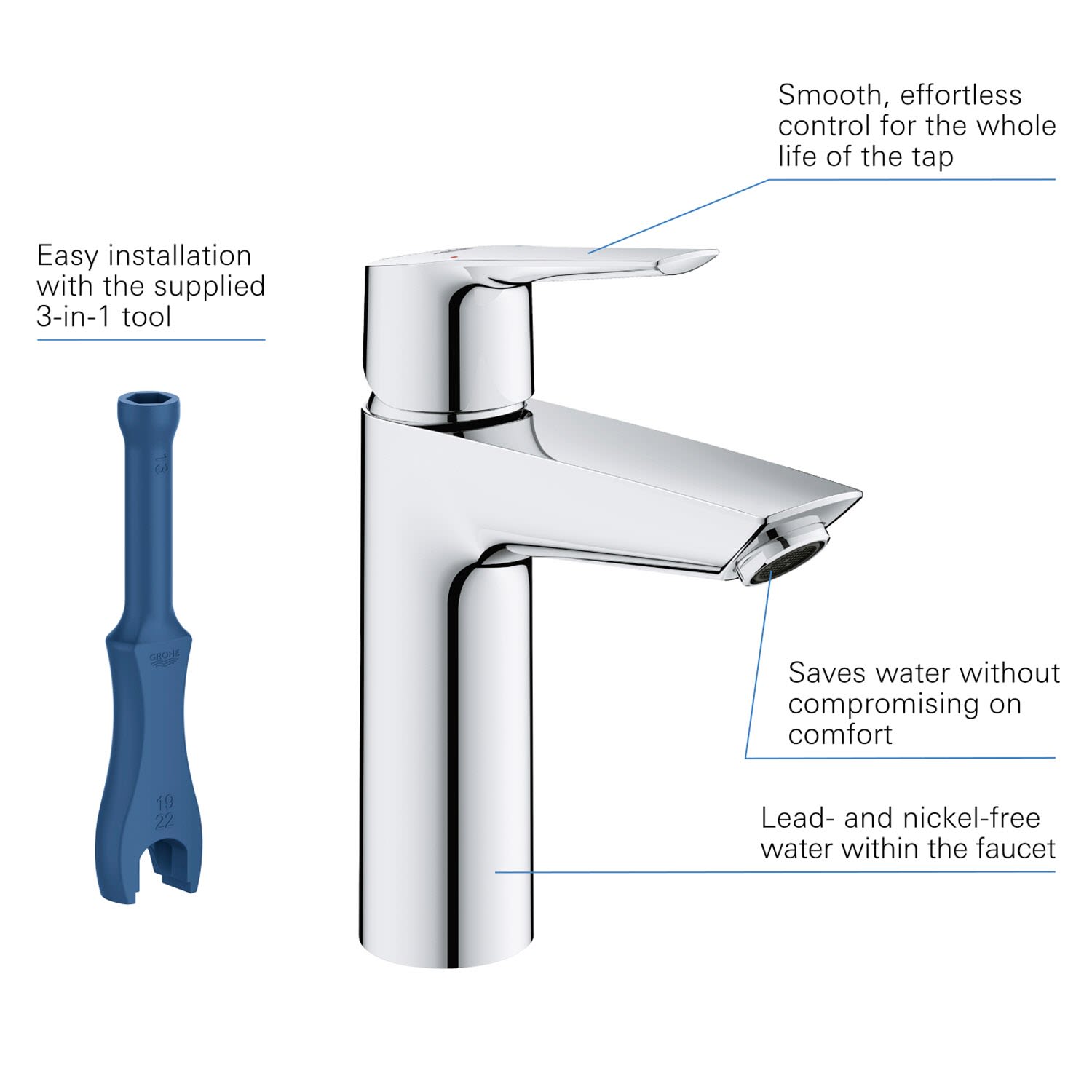 Die neue GROHE Start Waschtischarmatur Größe M wurde in Form und Funktion für die Anforderungen moderner Badezimmer optimiert. Sie zeichnet sich durch ein schlankes modernes Design aus und bietet mit dem höheren Auslauf noch mehr Komfort bei der Anwendung. Mit der glänzenden und zugleich langlebigen GROHE Long-Life Shine Beschichtung bleibt der makellos strahlende Glanz der Badezimmer-Armatur über viele Jahre hinweg erhalten.