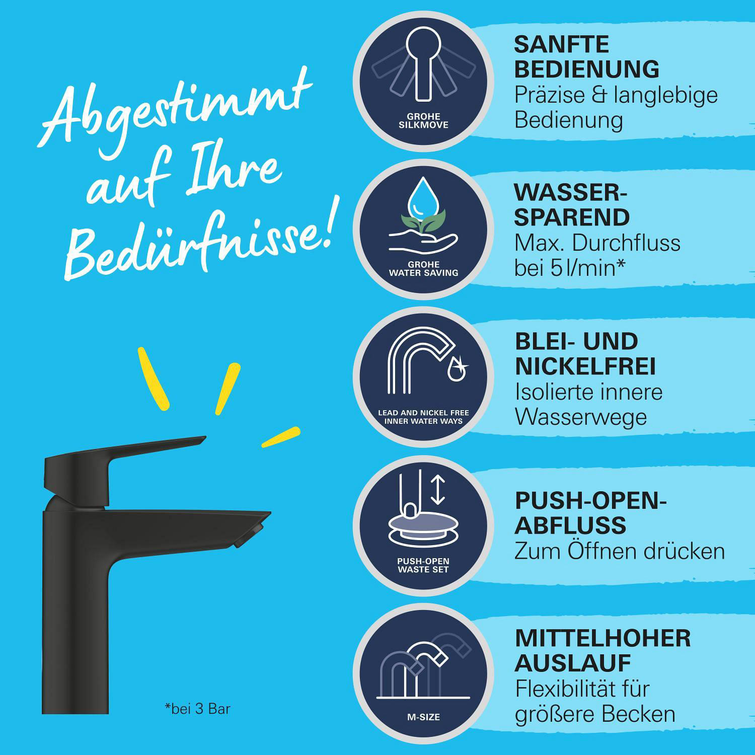Diese Einhand-Waschtischarmatur in Größe M verfügt über eine Push-open Ablaufgarnitur, die sich durch leichten Fingerdruck öffnet und schließt. Mit der strahlenden, langlebigen GROHE Long-Life Shine Beschichtung sieht diese Badezimmer-Armatur auch nach Jahren einfach glänzend aus.