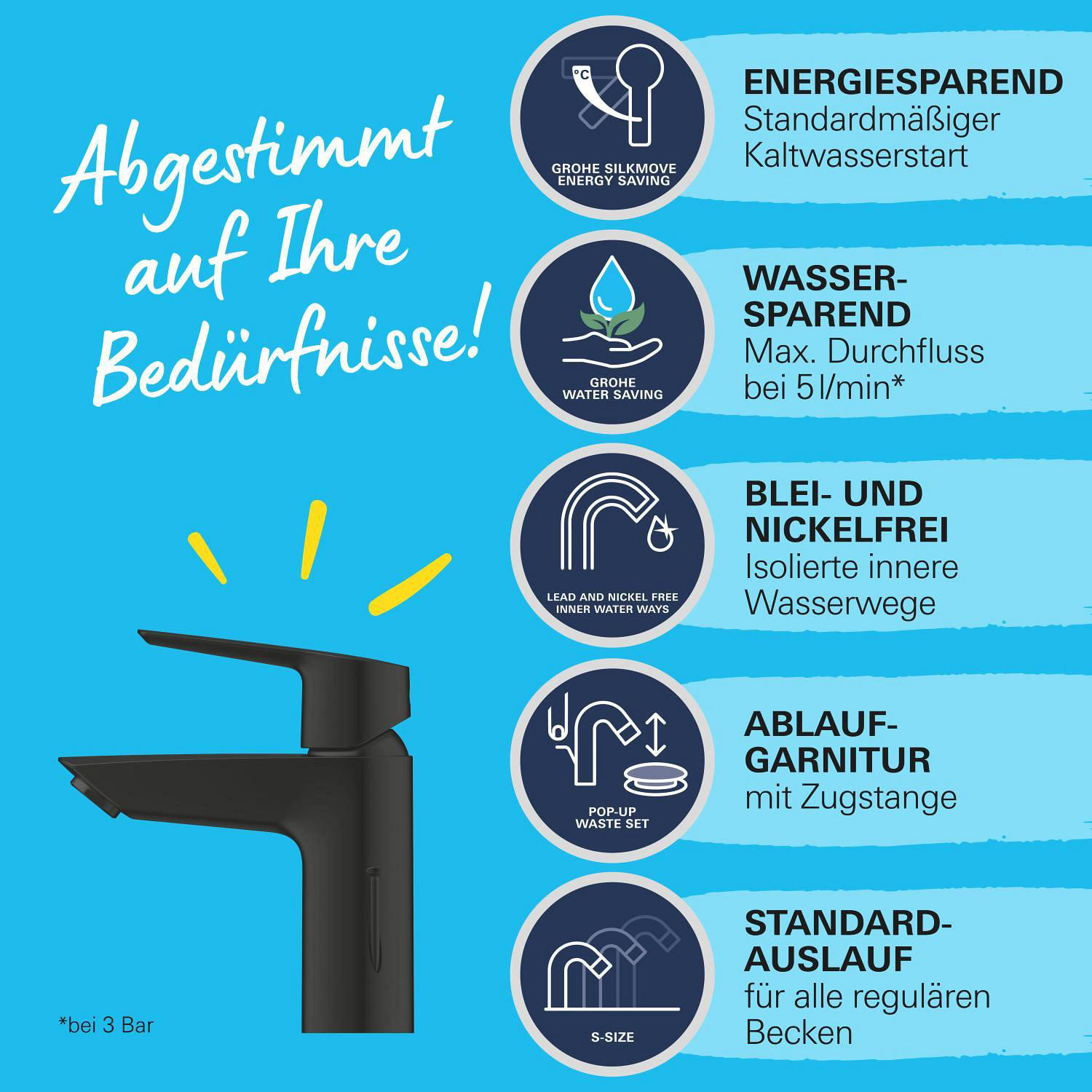Mit der GROHE Start Waschtischarmatur in elegantem Matt schwarz verleihen Sie Ihrem Badezimmer im Handumdrehen einen modernen, stilvollen Look. Die praktische Zugstangen-Ablaufgarnitur wird über eine kleine Stange an der Seite der Armatur betätigt. So lässt sich der Ablauf einfach öffnen und schließen, ohne dass Ihre Hände nass werden. Mit der langlebigen energiesparenden GROHE SilkMove Keramikkartusche lassen sich Wassermenge und -temperatur über einen robusten Metallhebel präzise regeln.