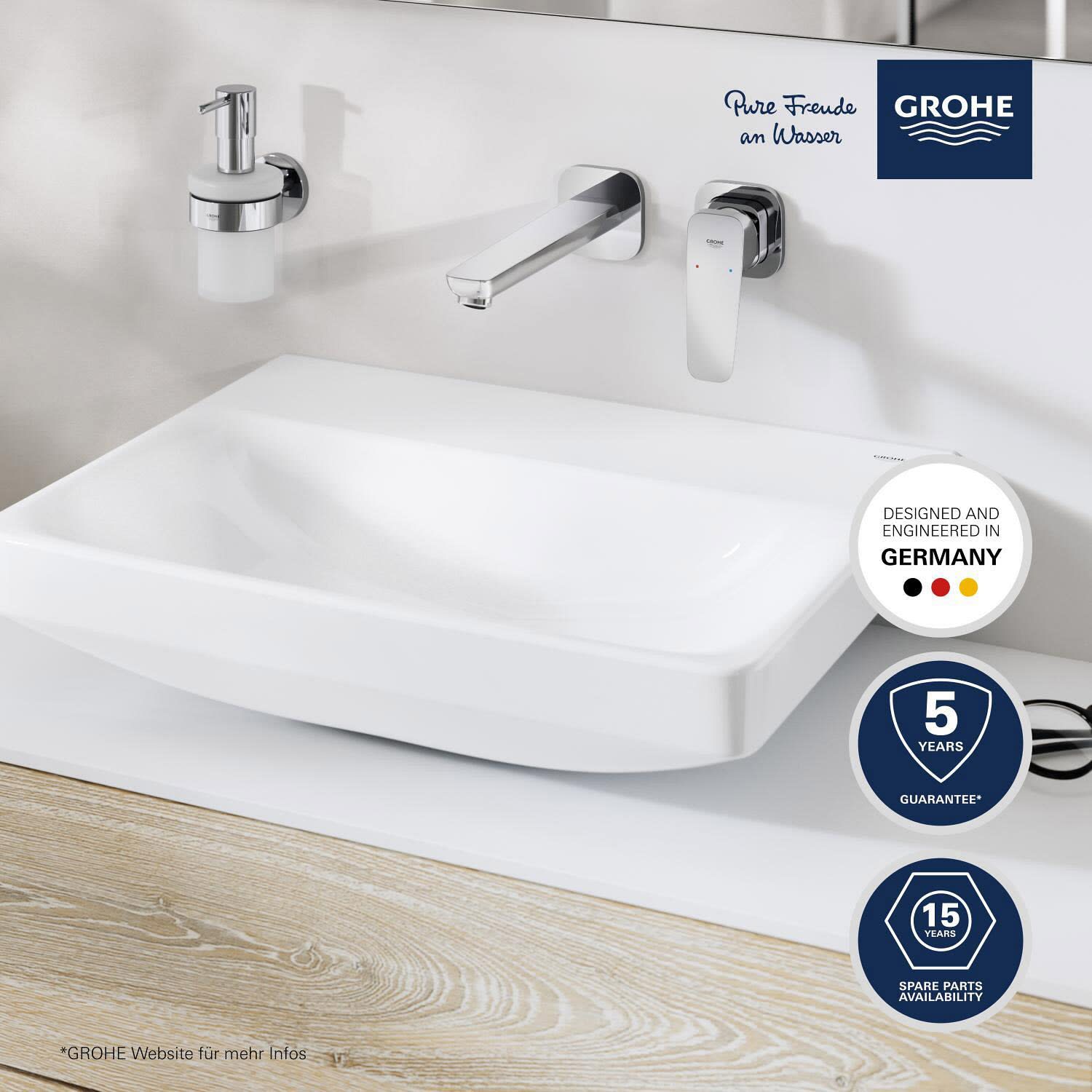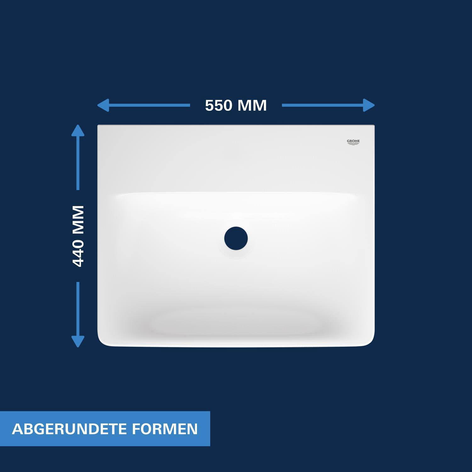 Werten Sie Ihr Badezimmer mit dem neuen GROHE Euro Keramik 55 Waschbecken auf – es vereint stilvolles Design mit hoher Funktionalität und Langlebigkeit. Das moderne, wandmontierte Becken misst 550 x 440 mm und wird ohne vorgestanztes Hahnloch und ohne Überlauf geliefert. Das glänzende Sanitärporzellan in Alpinweiß ist mit der innovativen antibakteriellen GROHE HyperClean-Beschichtung veredelt – einer besonders glatten, hygienischen Oberfläche, die über 99 % der bekannten Bakterien abweist.Unsere stilvolle und vielseitige Euro Keramik Kollektion wurde so entwickelt, dass sie perfekt zu den Armaturenlinien Eurosmart, Eurosmart Cosmopolitan und Cubeo passt – für ein rundum harmonisches Baddesign. Mit GROHE Keramiken profitieren Sie von unserer umfassenden Sanitärkompetenz sowie von 100 Jahren technischer Exzellenz durch LIXIL, der führenden Marke für Oberflächentechnologie. GROHE Euro Keramik – neue Maßstäbe für modernes Baddesign!