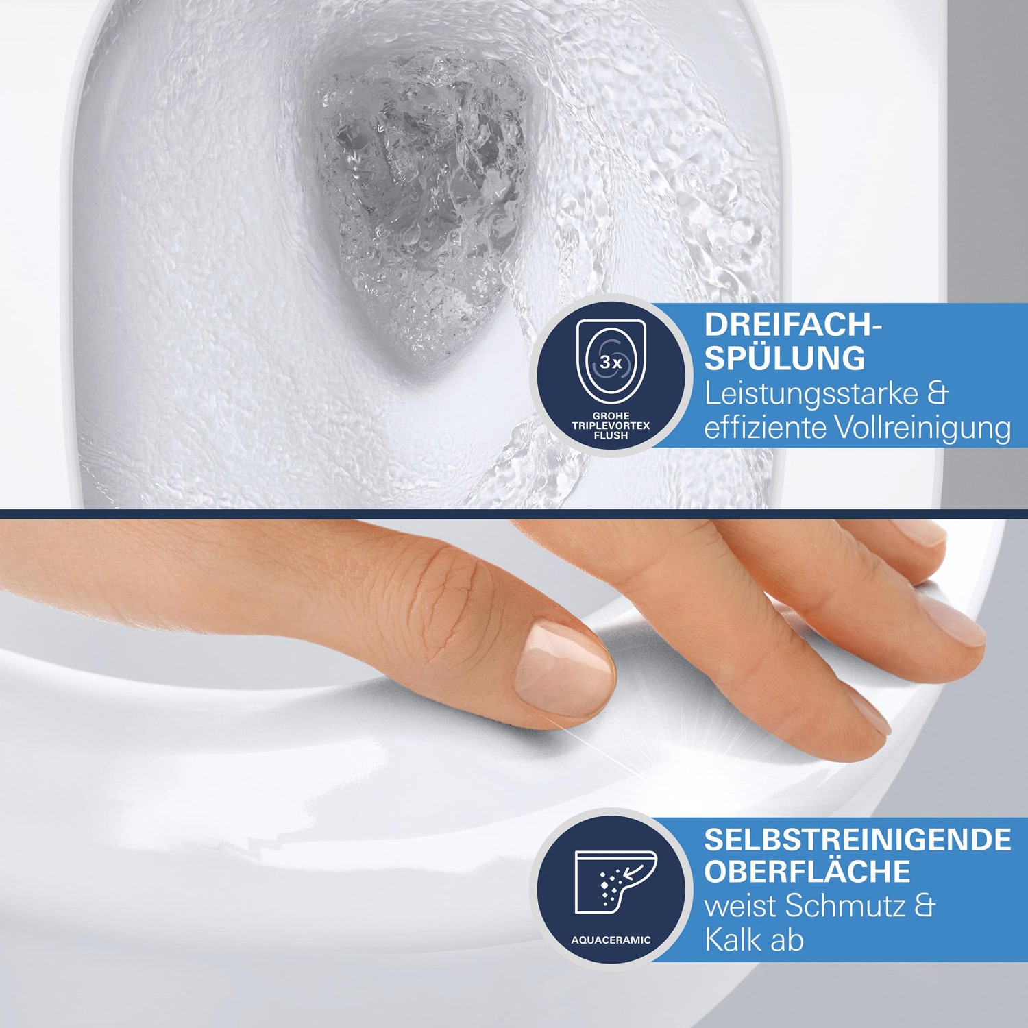 Schicht, an der Schmutz und Verkalkung nicht anhaften können. Nach dem Spülen bleiben keine Verschmutzungen übrig. - mit GROHE Triple Vortex (?)Bei jedem Spülgang strömt das Wasser aus drei Öffnungen und es entsteht ein Wirbel, der die gesamte Innenseite der Keramik erfasst und gründlich reinigt. Das macht TripleVortex höchst effektiv, zudem benötigt die Spülung kaum Wasser und ist sehr leise.