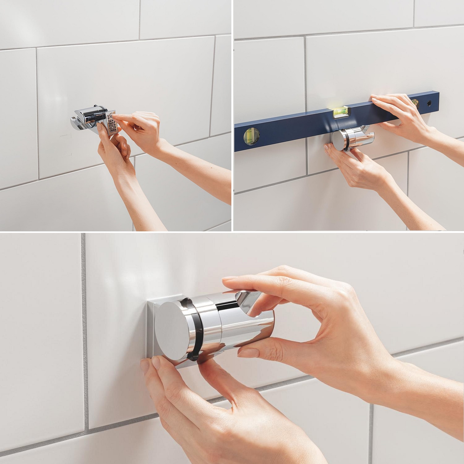Machen Sie sich die Modernisierung Ihres Badezimmers so einfach wie möglich: Mit hochwertigen Artikeln wie der fest montierten Vitalio Universal Wandhalterung, hergestellt von GROHE in Deutschland. Die GROHE Long-Life Oberfläche ist robust und pflegeleicht und behält ihren Glanz über viele Jahre. Ein GROHE QuickFix-Produkt für schnelle und mühelose Montage.