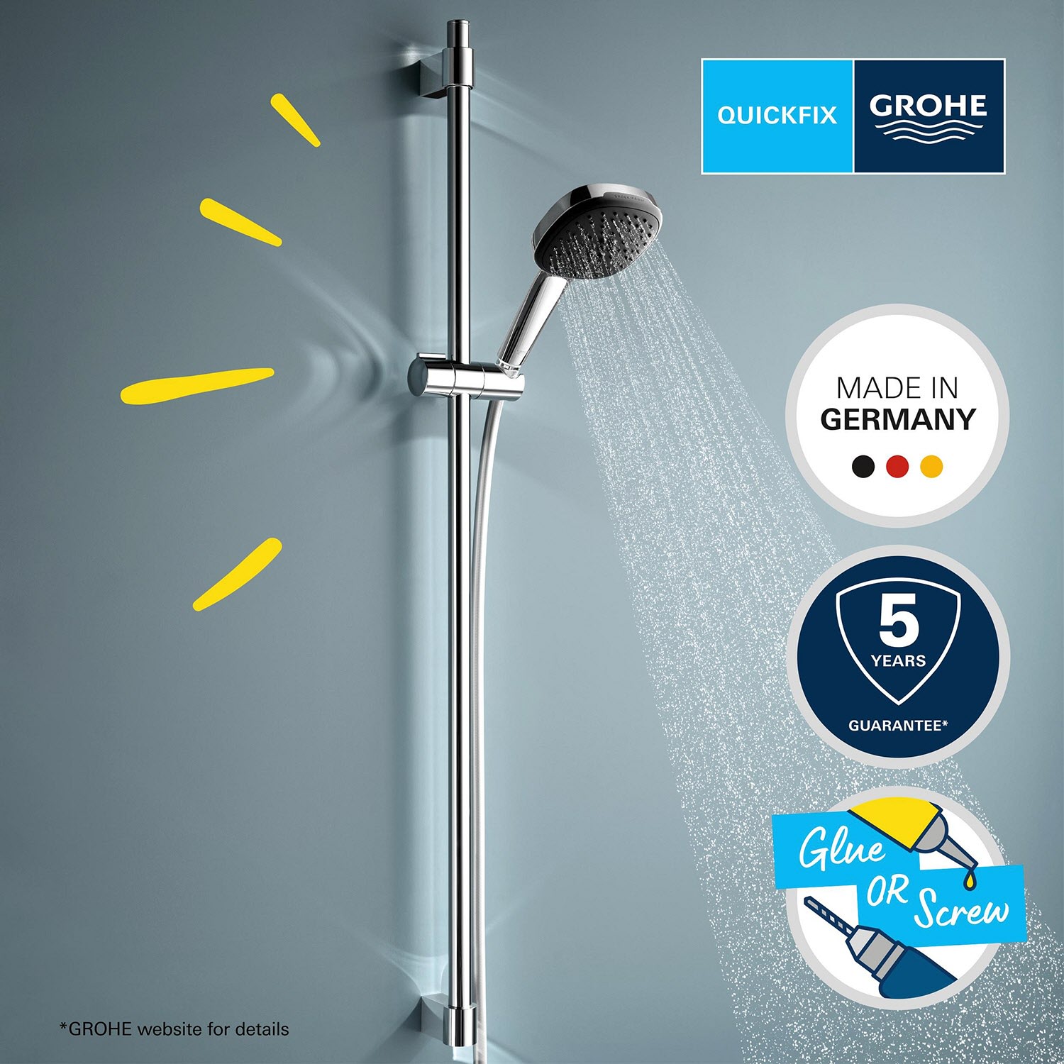- geeignet zum Bohren (Schrauben und Dübel beiliegend) oder Kleben (GROHE QuickGlue separat erhältlich)