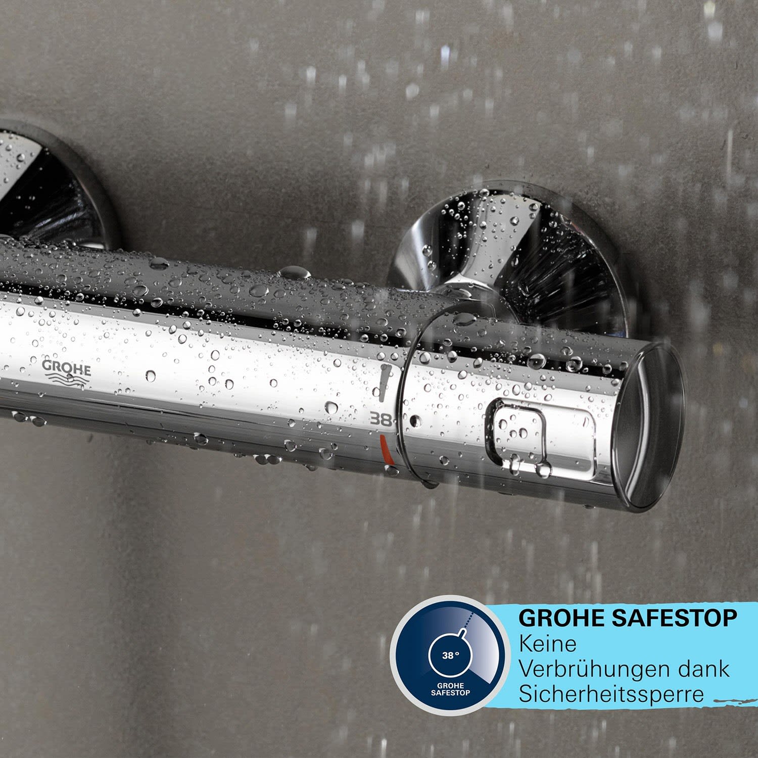 - der GROHE SafeStop Sicherungsknopf ist auf 38 °C eingestellt zum Schutz vor Verbrühungen