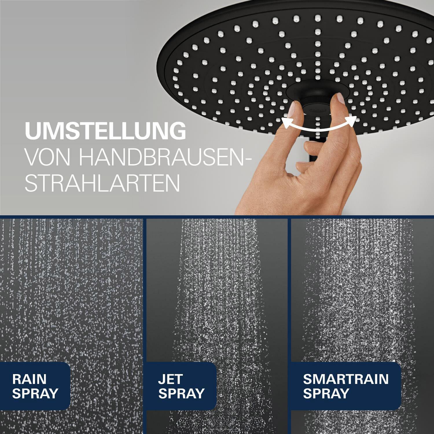 - ermöglicht den Wechsel zwischen: Kopfbrause Vitalio Joy 260, Strahlarten: Rain, SmartRain, Jet, mit Kugelgelenk, Drehwinkel ± 15° und Handbrause Vitalio Joy 110 Massage (27 319), Strahlarten: Rain, Massage, SmartRain