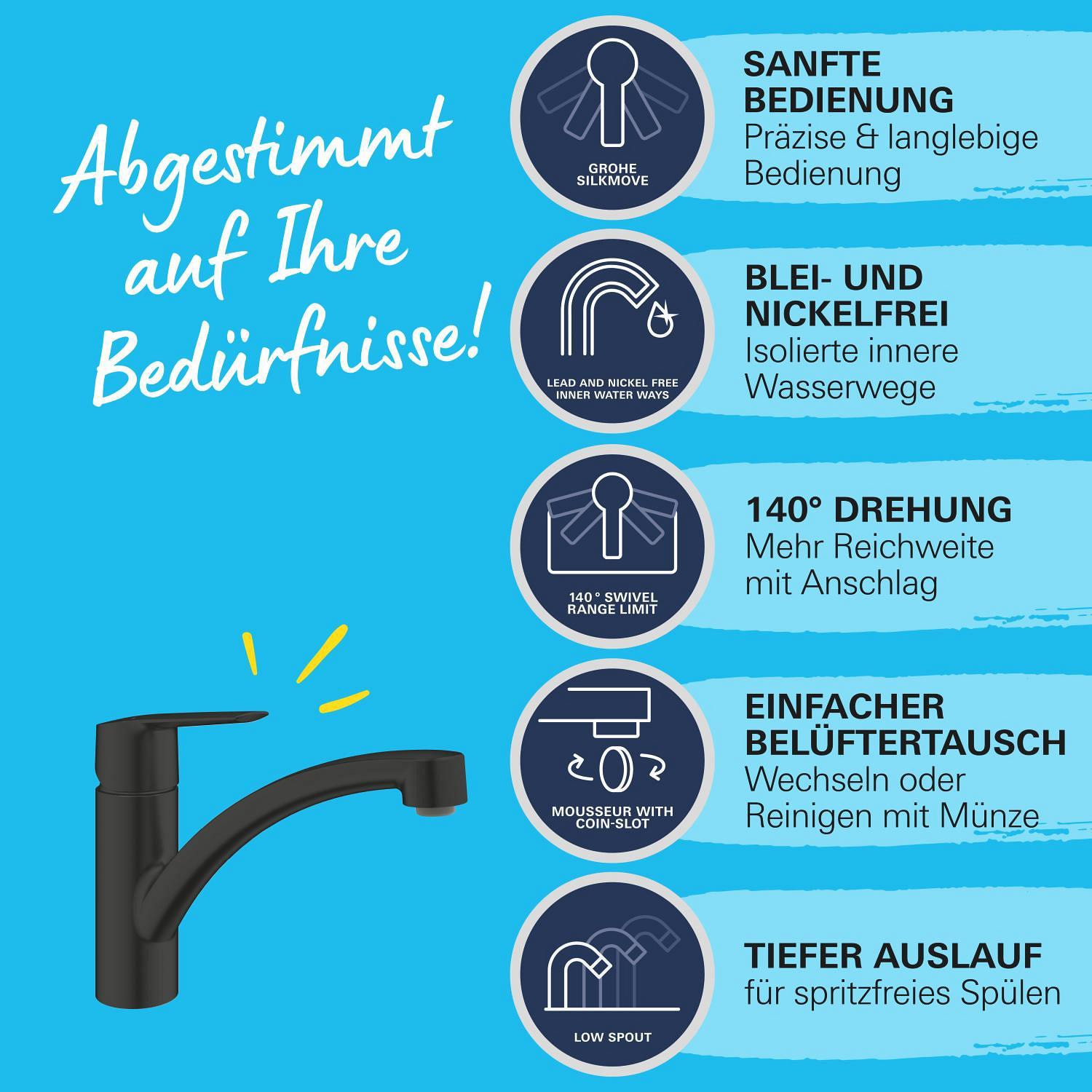 - GROHE Zero getrennte innenliegende Wasserwege - kein Kontakt mit Blei oder Nickel innerhalb der Armatur