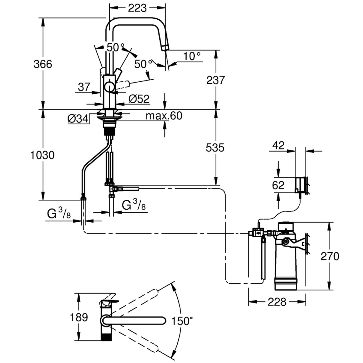 - Schwenkbereich 150°