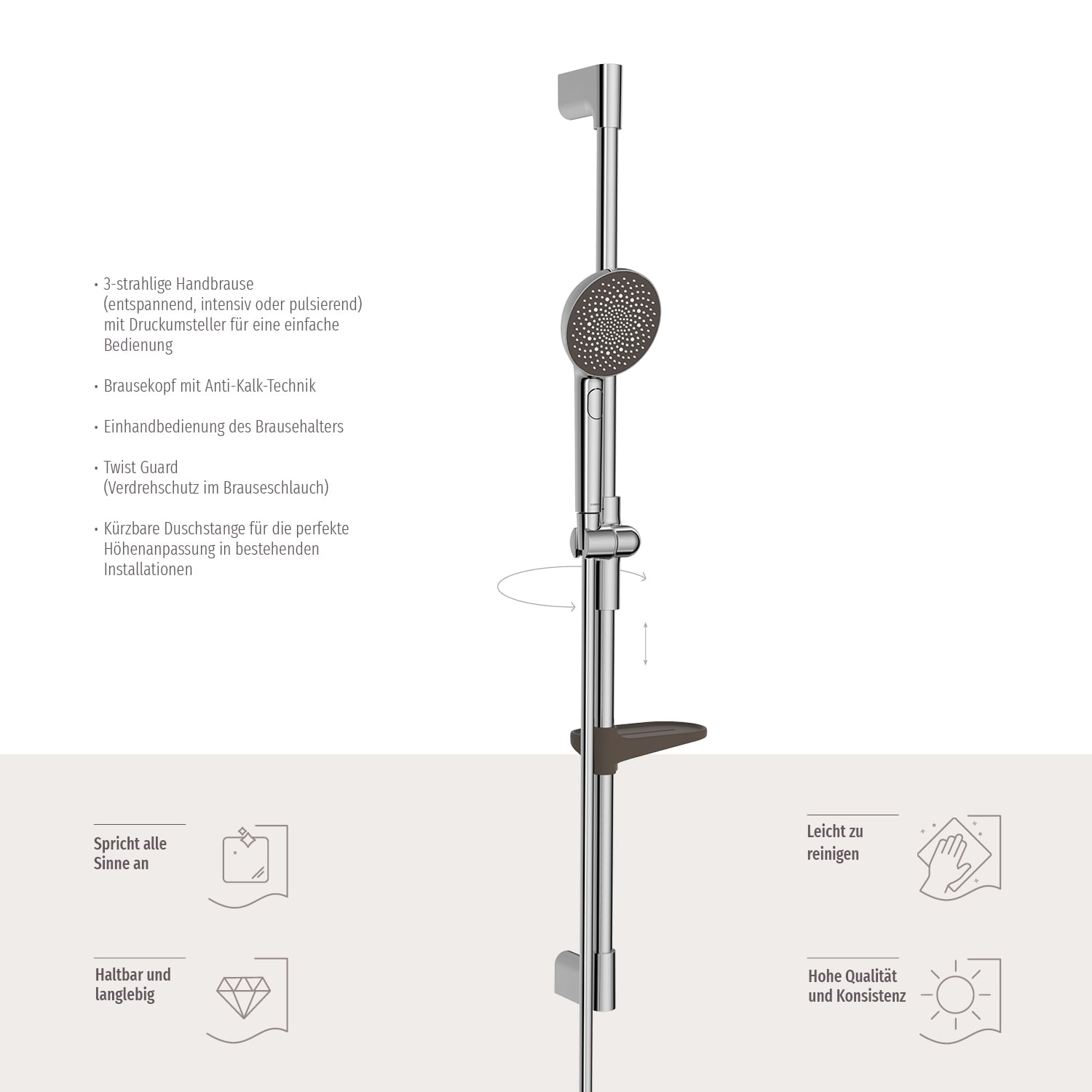 - Höhenverstellbarer Brausehalter: Praktischer Schieber mit Drucktaste für eine einfache Einhandbedienung.