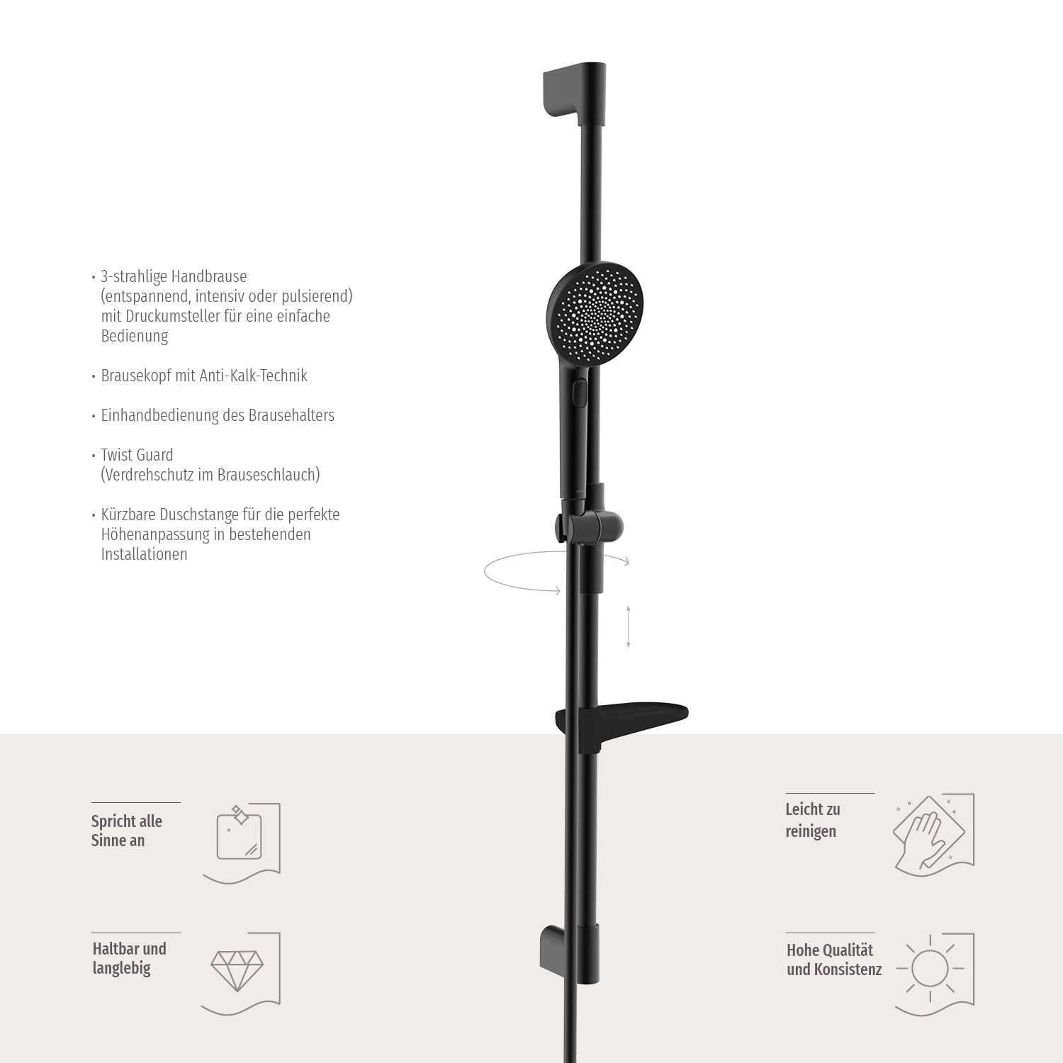 - Höhenverstellbarer Brausehalter: Praktischer Schieber mit Drucktaste für eine einfache Einhandbedienung.