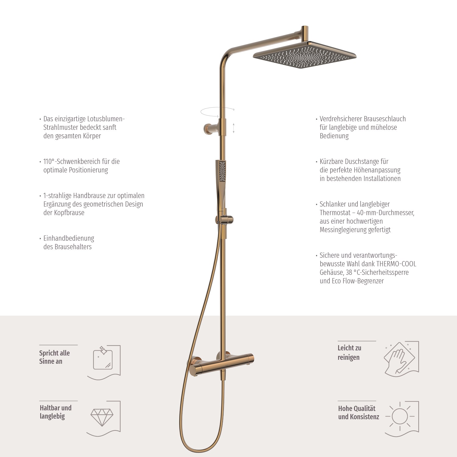 - THERMO-COOL Technologie sorgt dafür, dass das Thermostat-Gehäuse nicht überhitzt, was es deutlich sicherer macht als herkömmliche Thermostatarmaturen.
