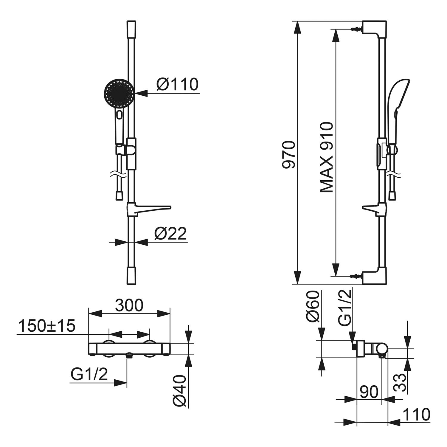 - Installationsabstand Brausestange: max: 91 cm