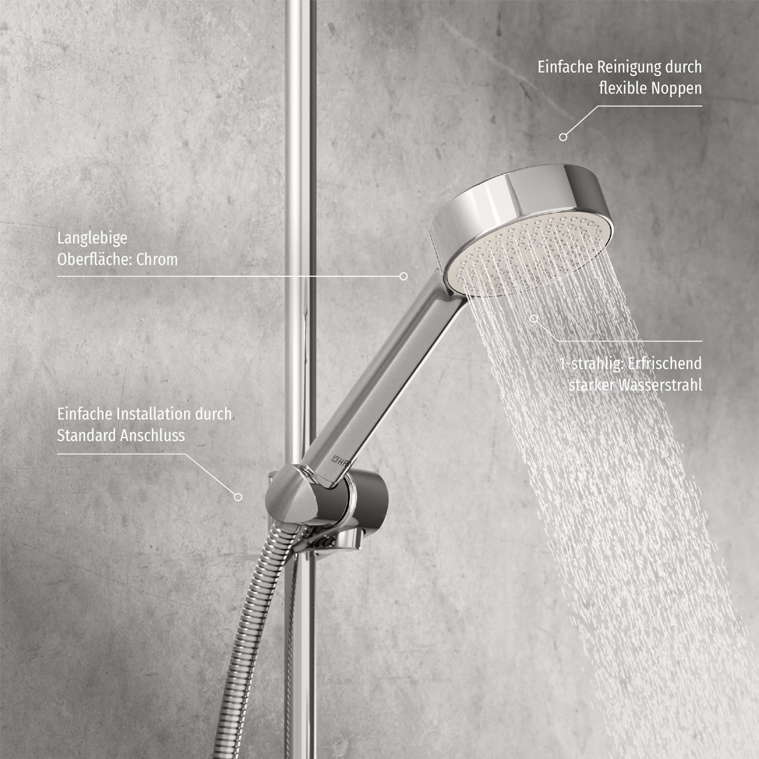 - Duschstrahlart: erfrischend – starker Wasserstrahl, aktiviert und erfrischt den Körper