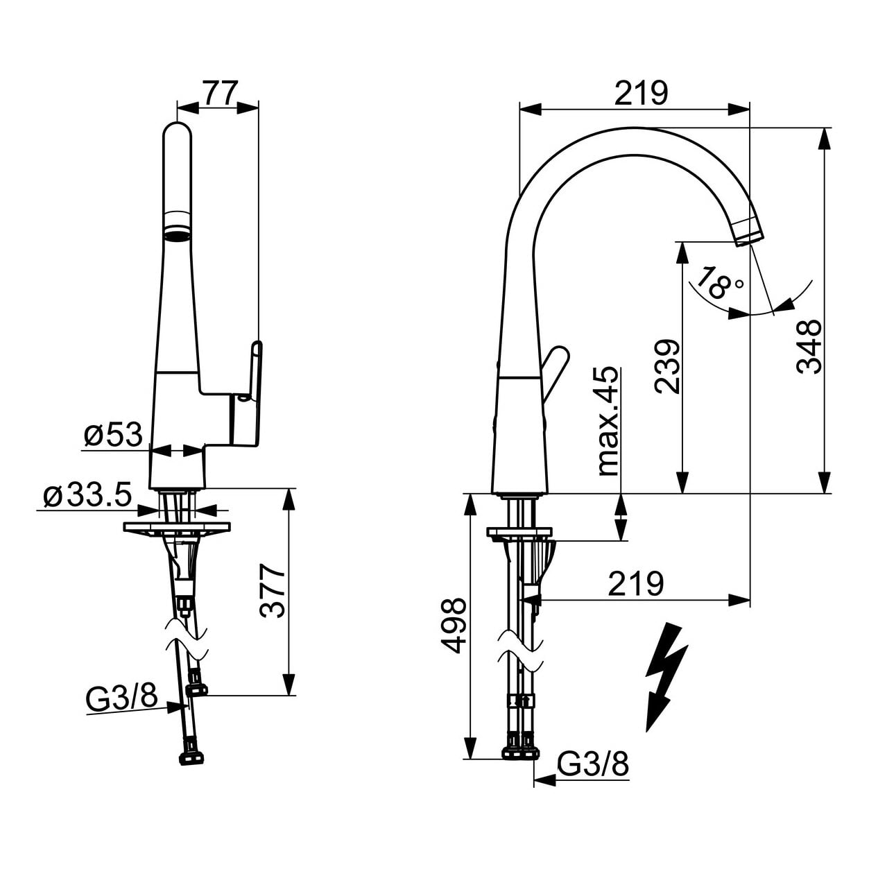 - Schwenkbereich des Auslaufs: 120° (60° / 0°)