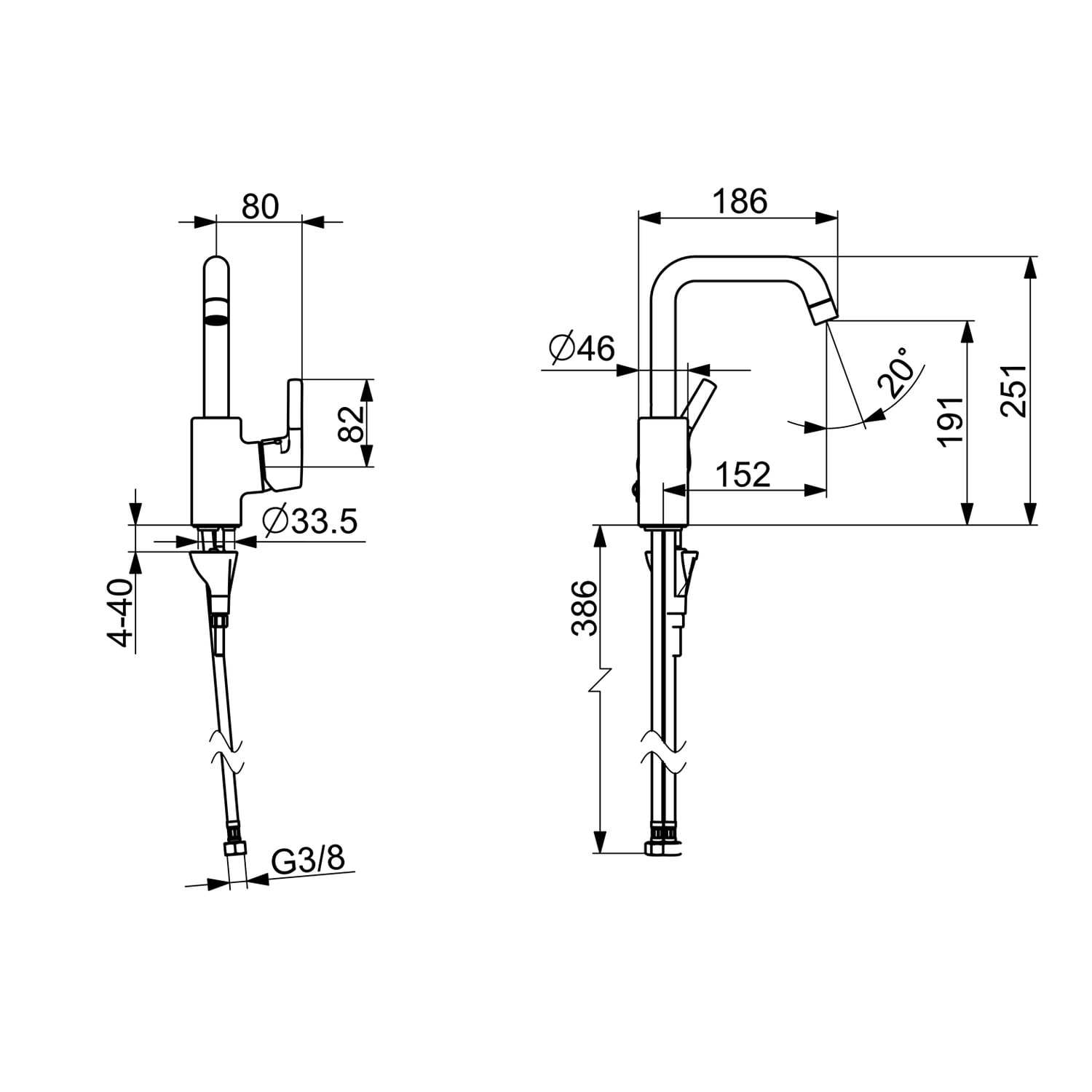 - schwenkbereich des Auslaufs: 120° (60° / 0°)