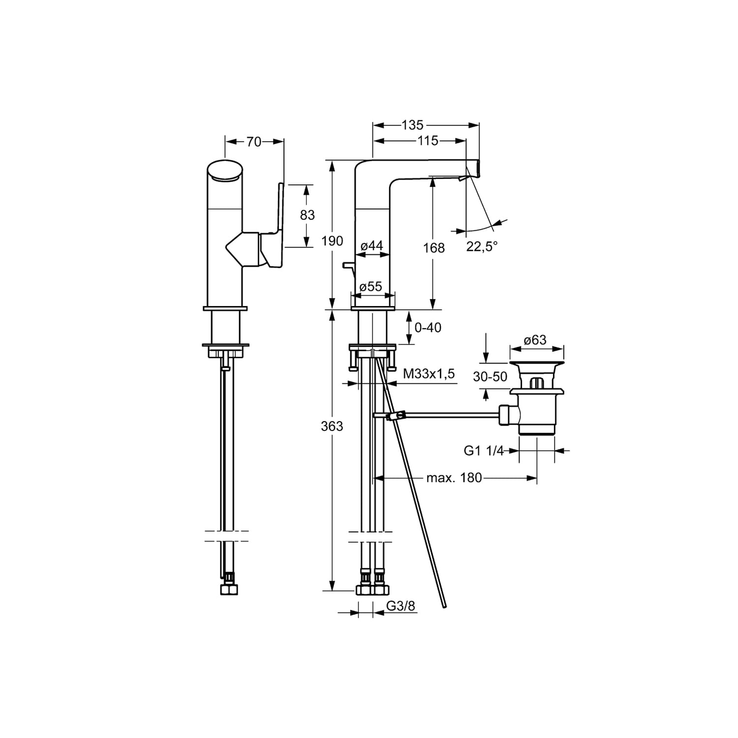 - Anschluss über flexible Druckschläuche G 3/8