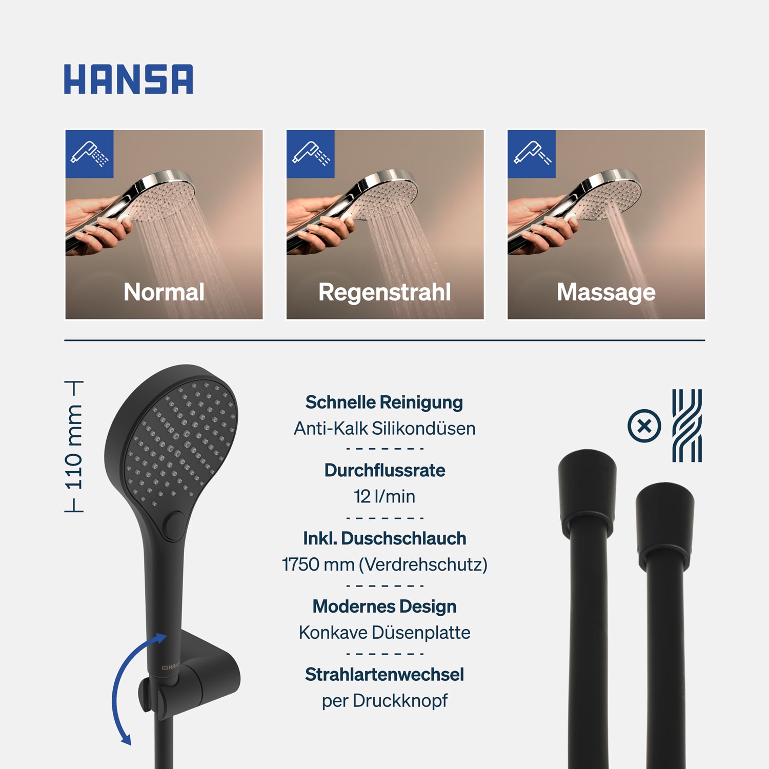 - HANSAVIVA 3-Strahl-Handbrause rund (Ø 11 cm) inkl. Brauseschlauch (175 cm) und Halter