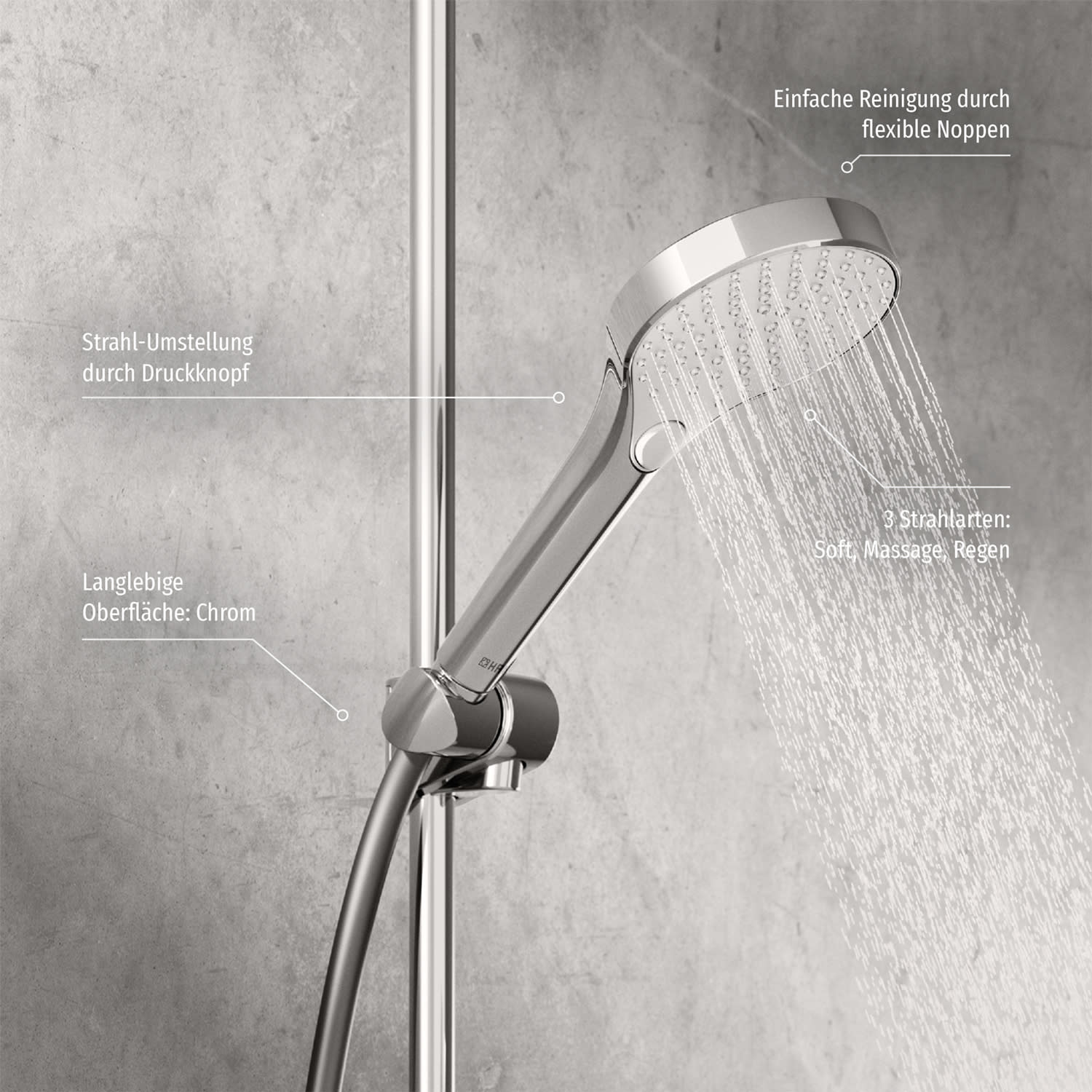- 3 Strahlarten: Normal-, Massage- u. Regenstrahl