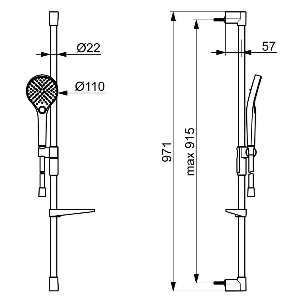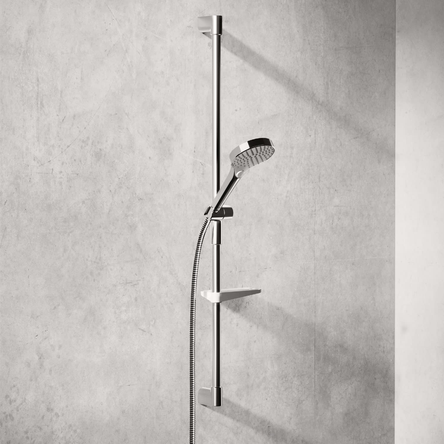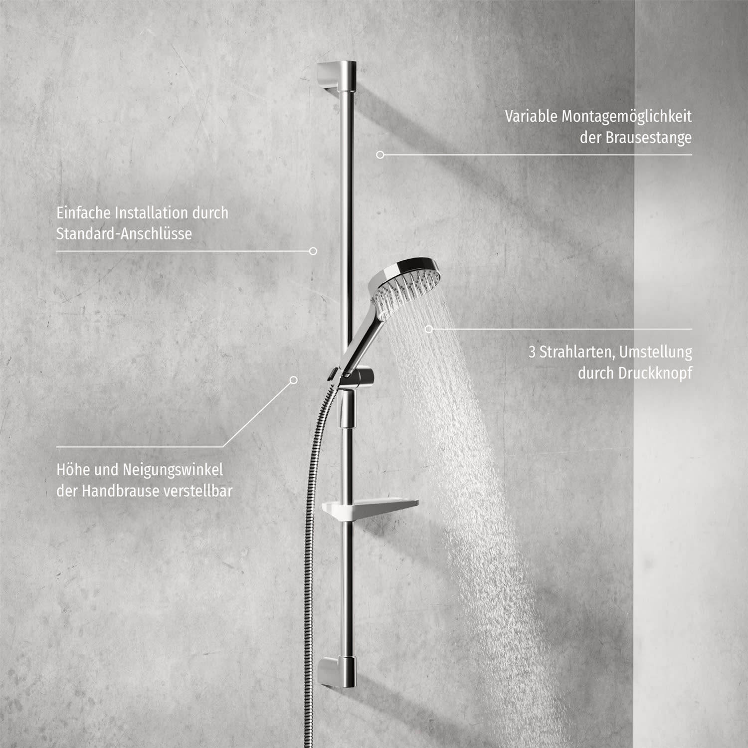 - Duschteile: Handbrause, Brausestange, verstellbare Brausestangenhalterung, Seifenschale und Brauseschlauch 175 cm