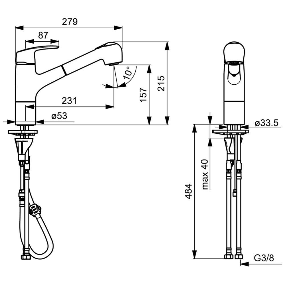- Anschluss über flexible Druckschläuche G 3/8
