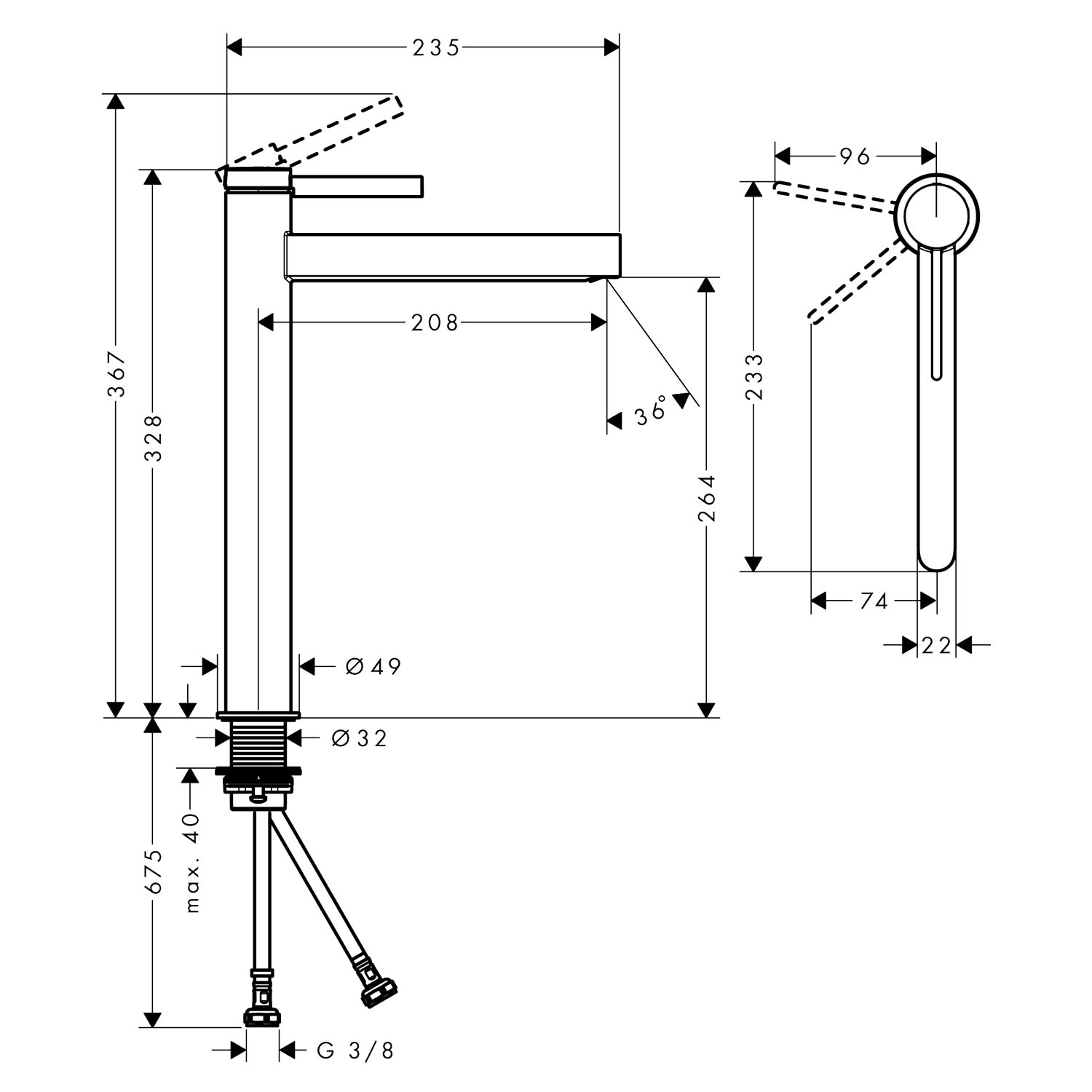 - Einfach eingebaut: Die Armatur wird über flexible Schläuche mit den Wasseranschlüssen verbunden (G 3/8)