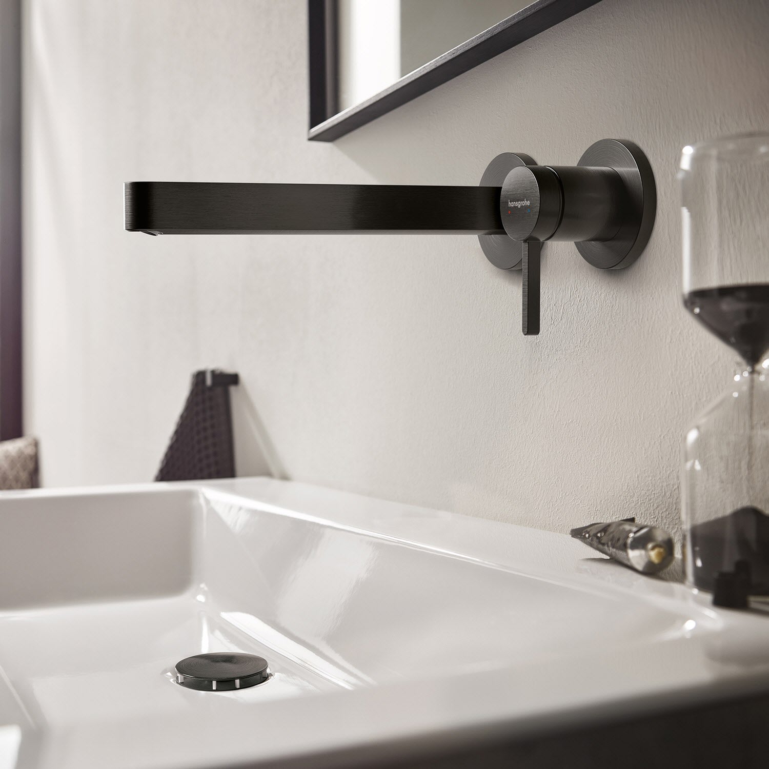 Schlanker hansgrohe Design-Einhebelmischer in Brushed Black Chrome für die Wandmontage