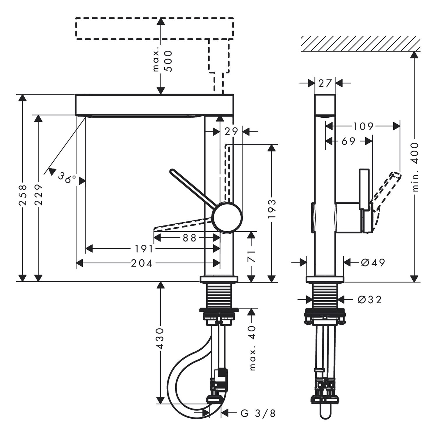 - Einfach eingebaut: Die Armatur wird über flexible Schläuche mit den Wasseranschlüssen verbunden (G 3/8)