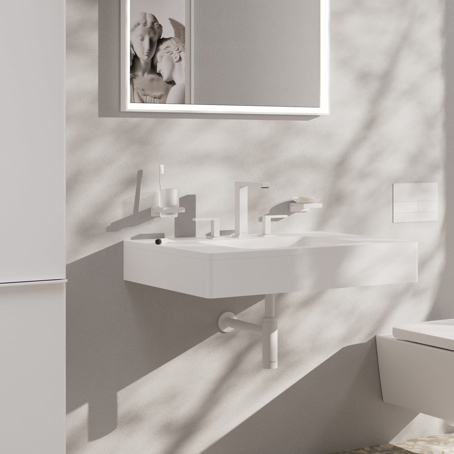 - mit Ablaufgarnitur: der Push-Open-Ablauf wird über einen Druckstopfen bedient. Ohne Hebel an der Rückseite wirkt das Design noch klarer