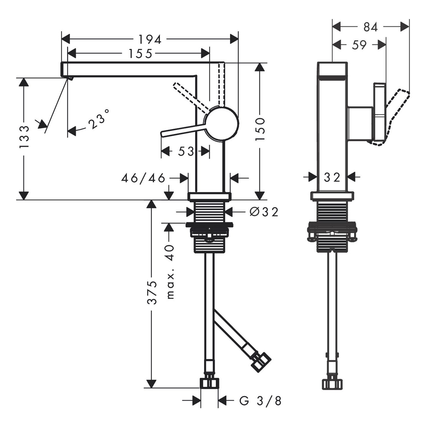 - einfach installiert: die Armatur wird über flexible Schläuche mit den Wasseranschlüssen verbunden (G 3/8)