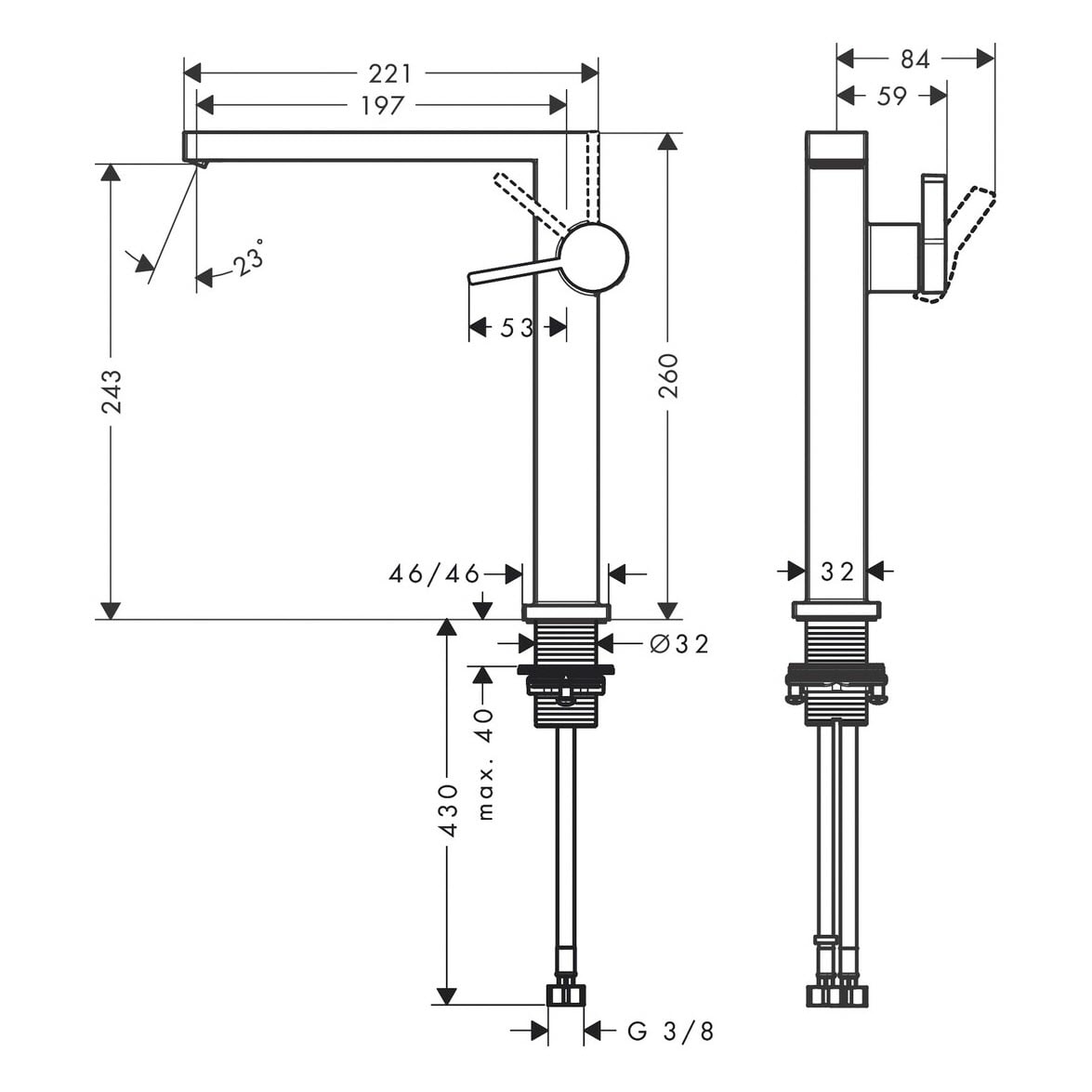 - einfach installiert: die Armatur wird über flexible Schläuche mit den Wasseranschlüssen verbunden (G 3/8)