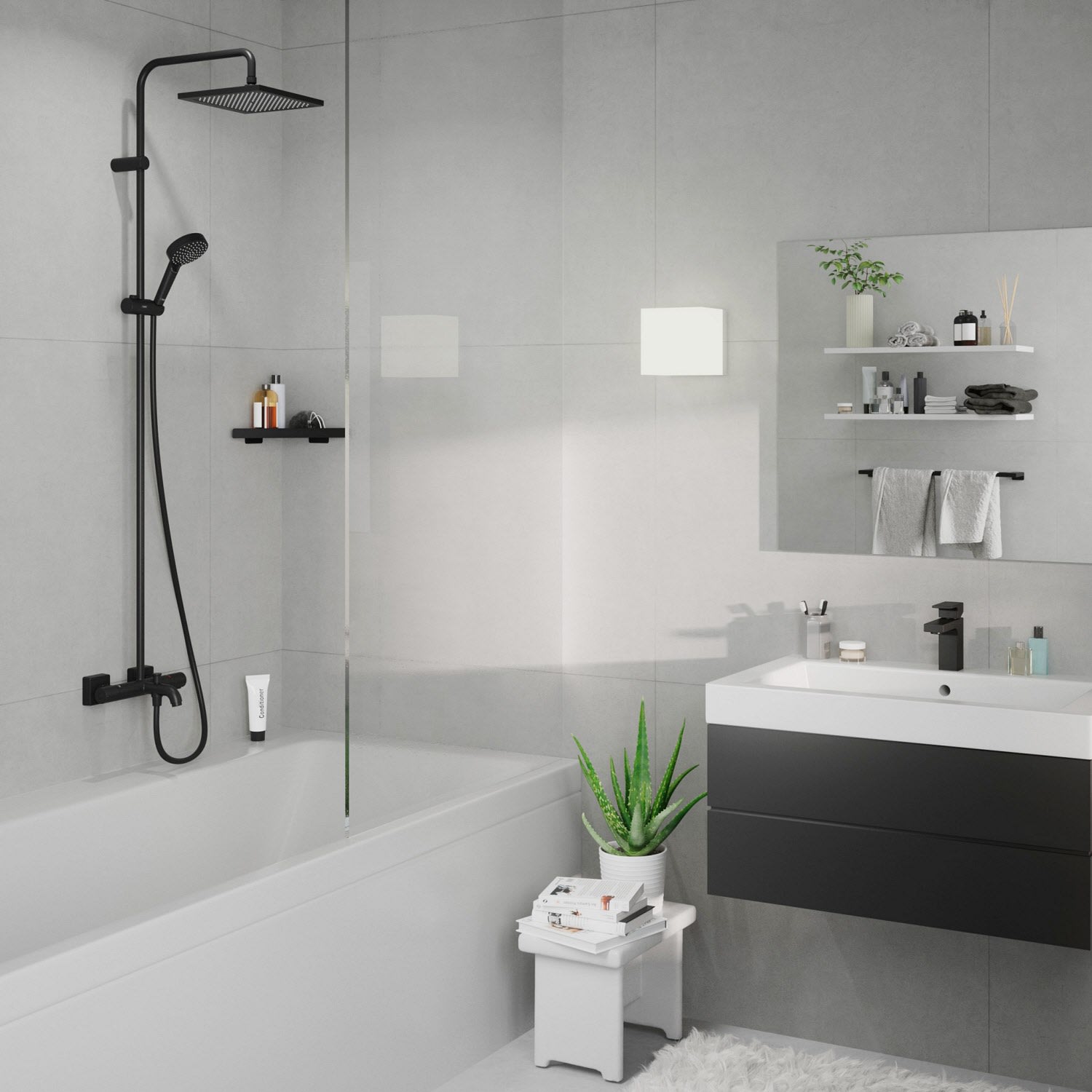 - Lieferumfang: Showerpipe mit Wannenthermostat, Rosetten, S-Anschlüsse, Befestigungsmaterial, Montageanleitung
