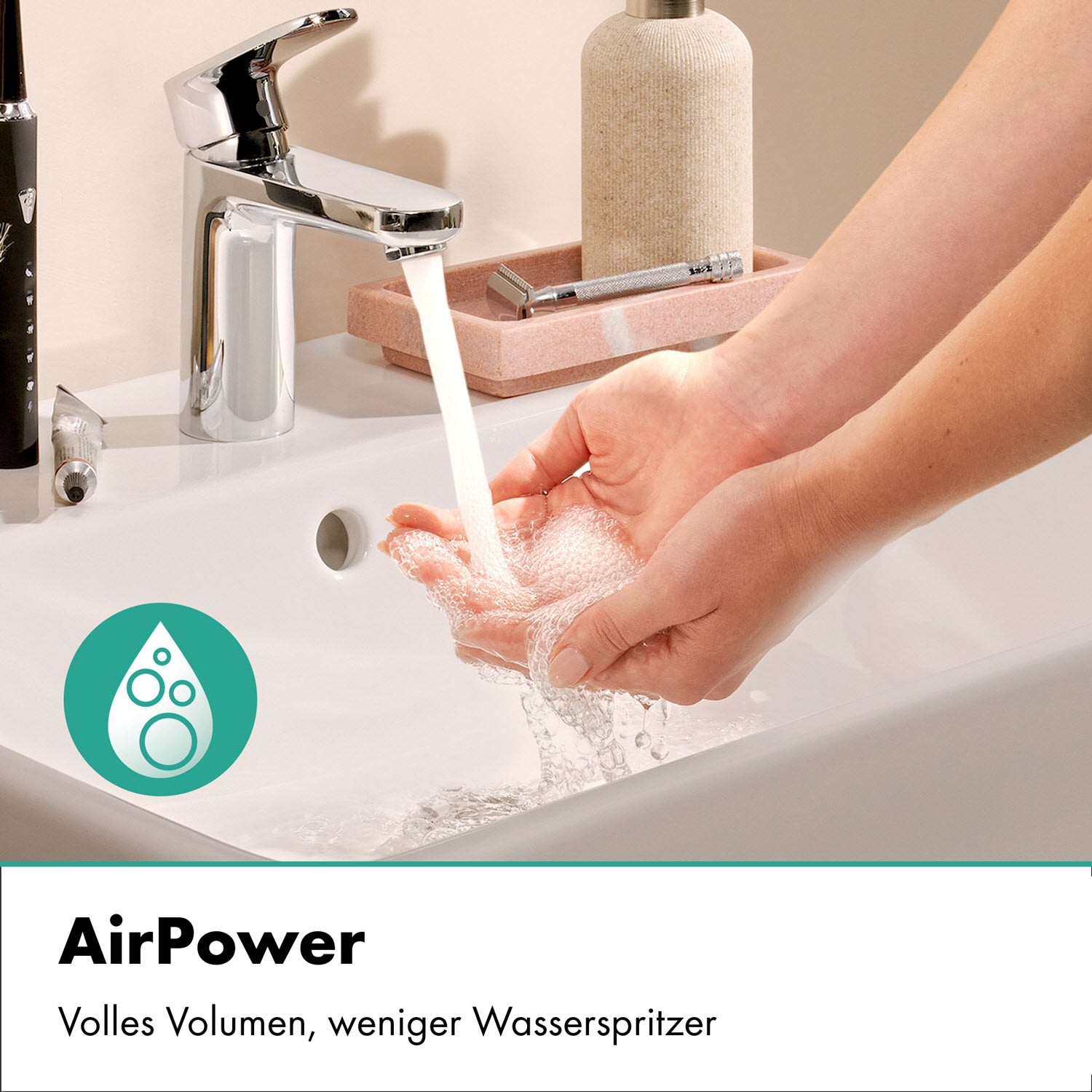 - für einen vollen Wasserstrahl, der weniger spritzt, reichert diese Armatur Wasser mit Luft an (AirPower)