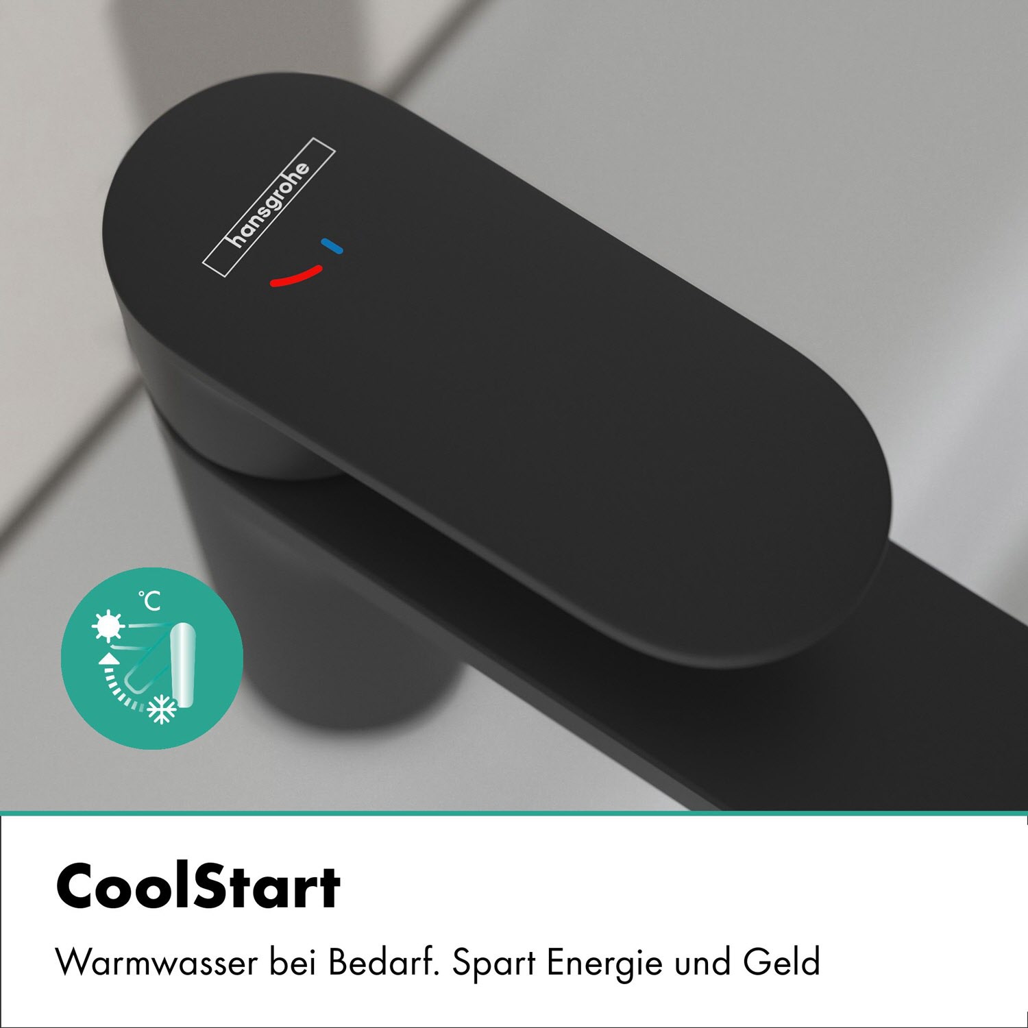 - Hilft beim Energiesparen: Steht der Hebel in der Mitte, fließt Kaltwasser. Erst wenn er nach links gedreht wird, fließt Warmwasser (CoolStart)