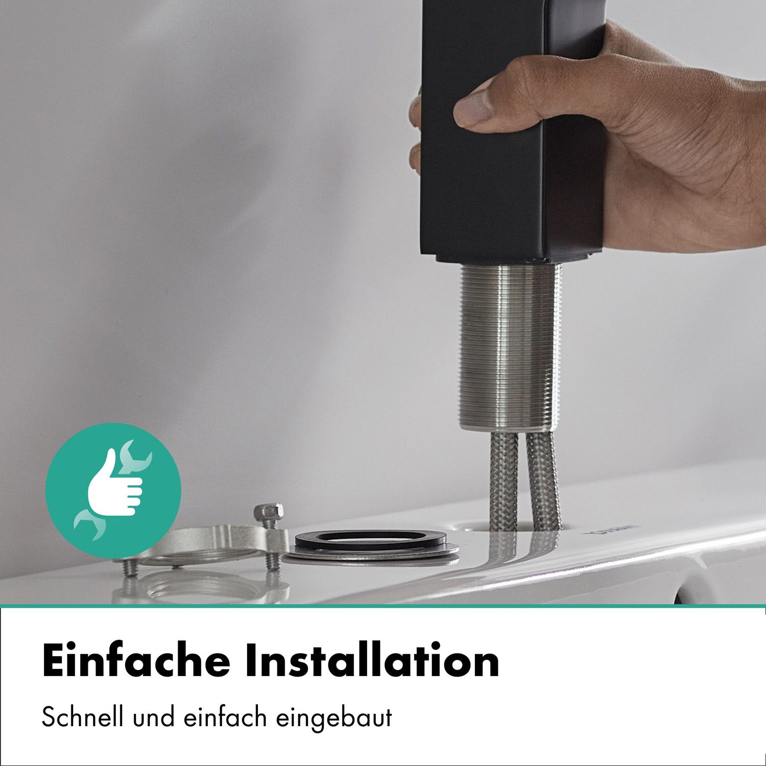 - Einfach eingebaut: Die Armatur wird über flexible Schläuche mit den Wasseranschlüssen verbunden (G 3/8)