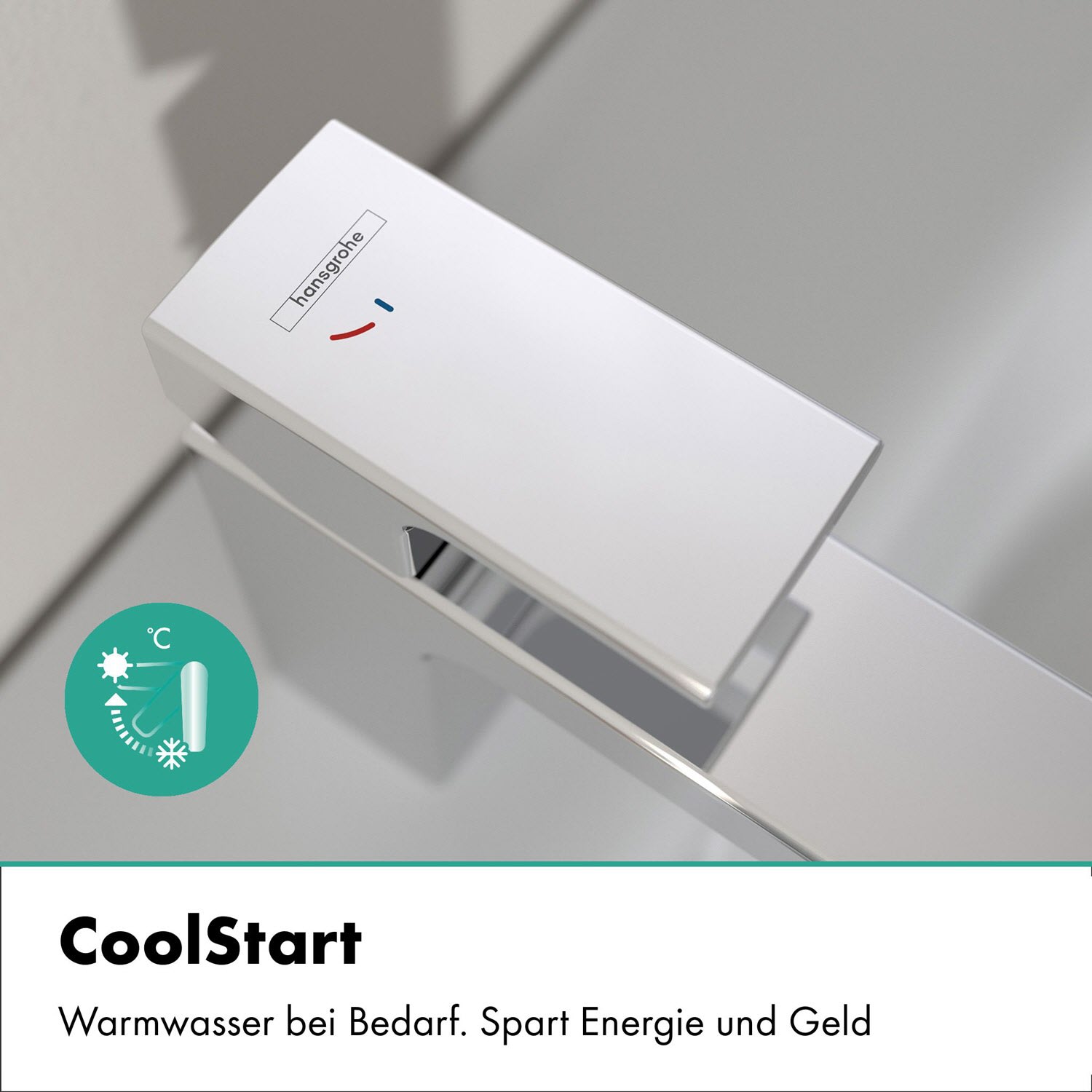 - Hilft beim Energiesparen: Steht der Hebel in der Mitte, fließt Kaltwasser. Erst wenn er nach links gedreht wird, fließt Warmwasser (CoolStart)