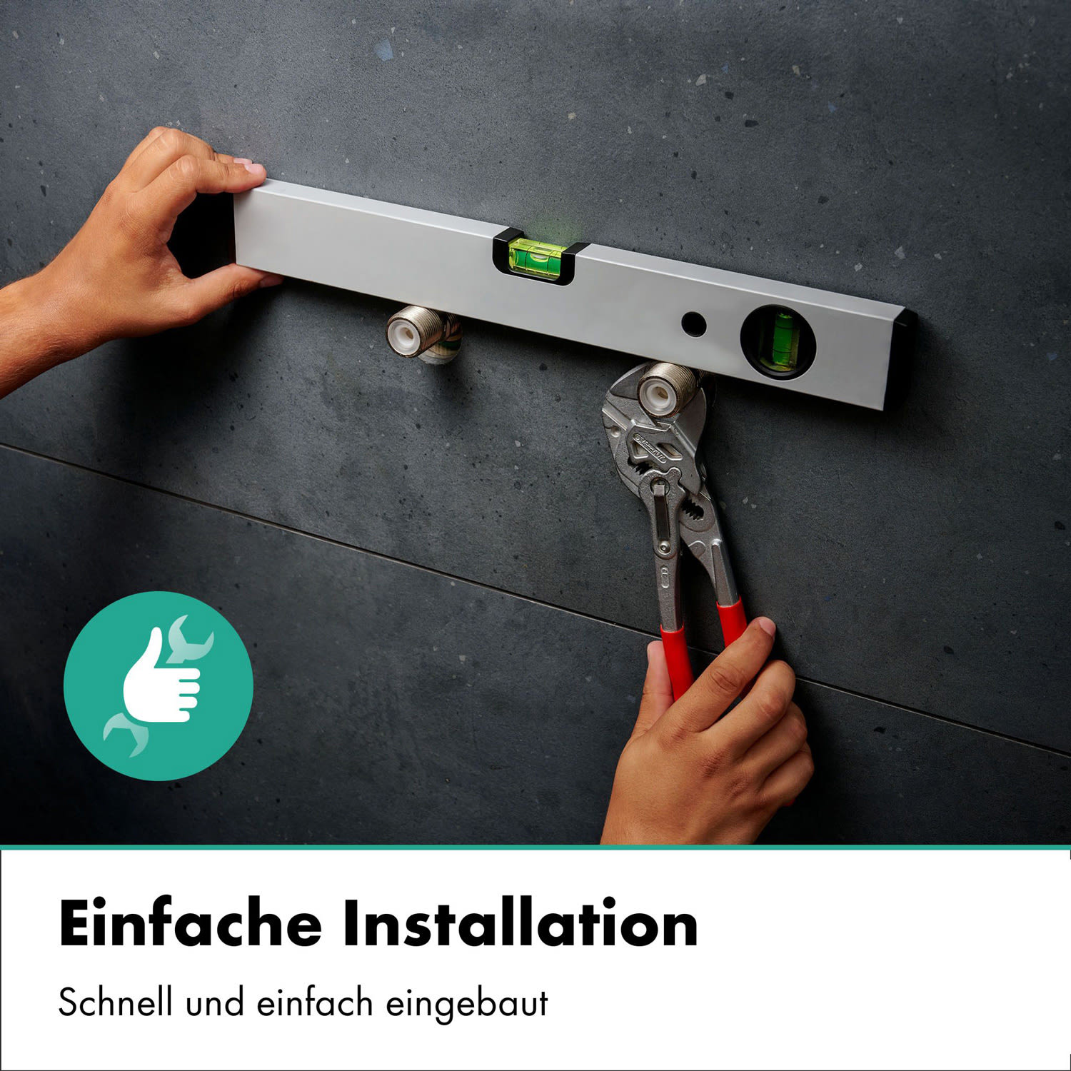 - Einfach eingebaut: Mitgelieferte S-Anschlüsse werden auf den Wasserauslass geschraubt – die Wand bleibt unversehrt