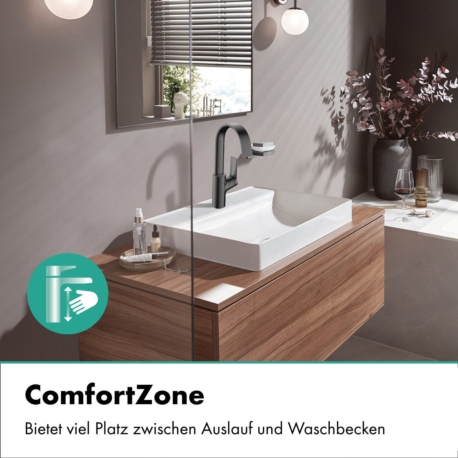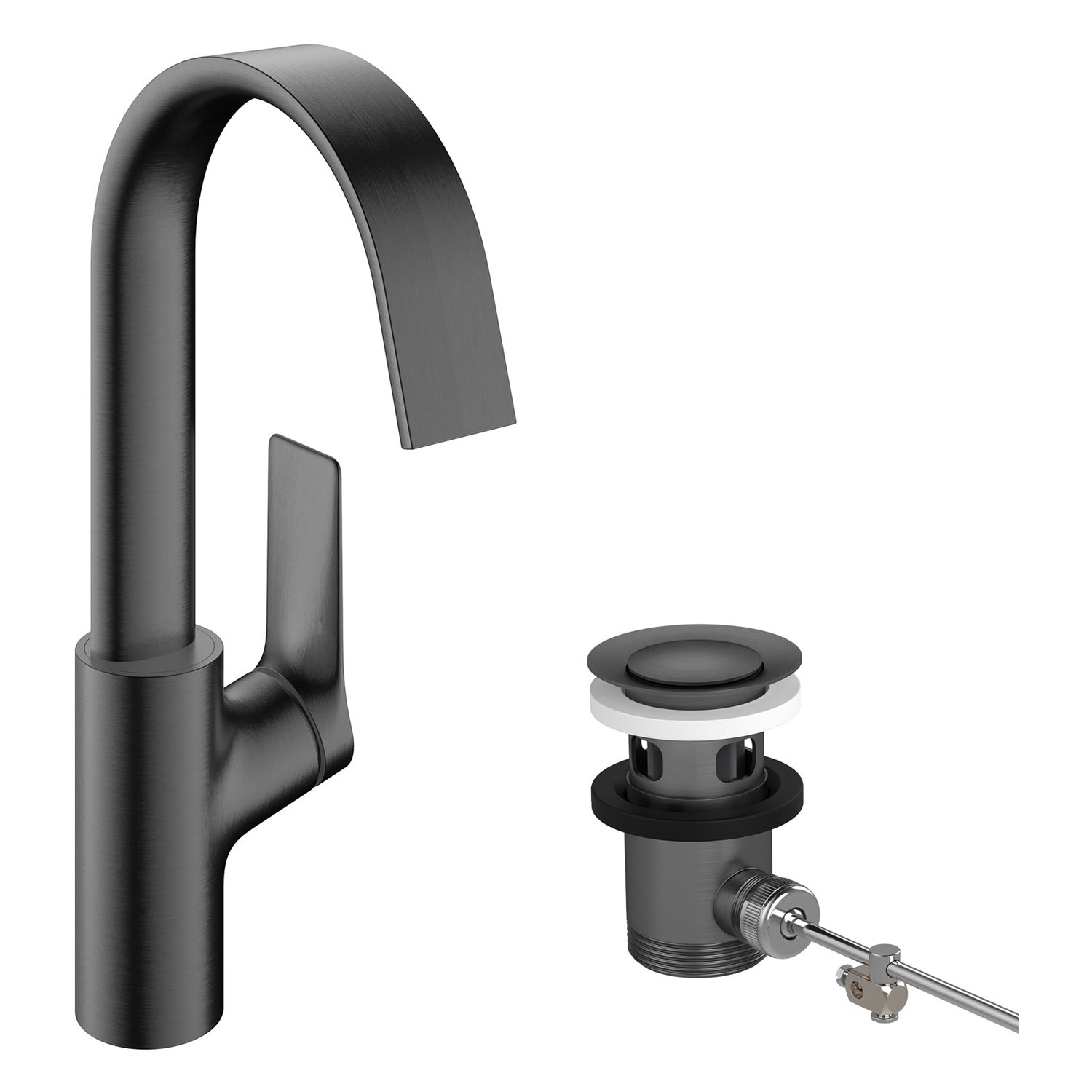 Der Vivenis Einhebel-Waschtischmischer 210 mit Schwenkauslauf und Zugstangen-Ablauf von hansgrohe beeindruckt durch seine harmonische Form und zaubert mit der Oberfläche in Brushed Black Chrome eine elegante Ästhetik ins Bad. Wie ein kleiner Wasserfall fließt der extra breite Wasserstrahl aus dem sanft geschwungenen Auslauf (WaterfallStream). Das bietet jeden Tag aufs Neue ein besonderes Erlebnis und schafft einen Ort der Erholung.