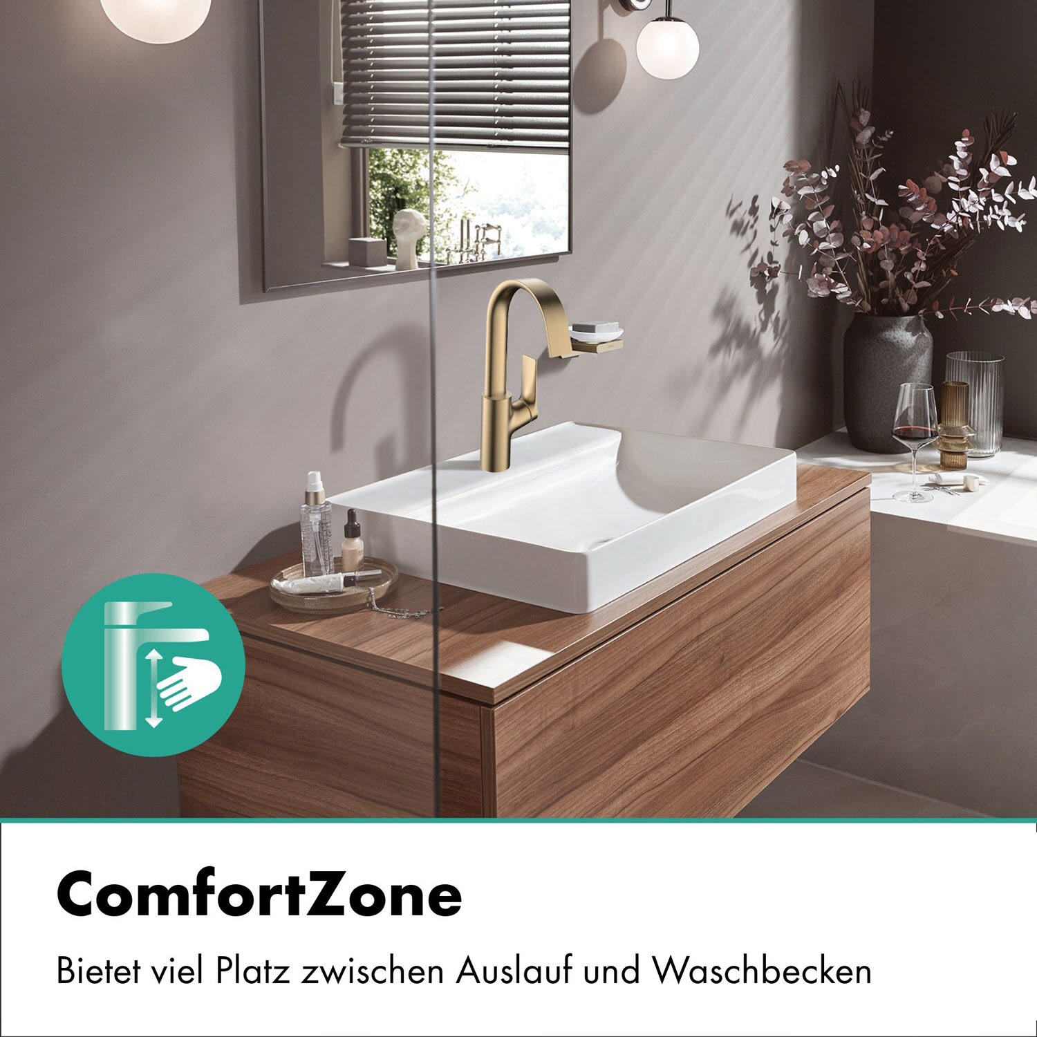 Der Vivenis Einhebel-Waschtischmischer 210 mit Schwenkauslauf von hansgrohe beeindruckt durch seine harmonische Form und zaubert mit der Oberfläche in Brushed Bronze eine elegante Ästhetik ins Bad. Wie ein kleiner Wasserfall fließt der extra breite Wasserstrahl aus dem sanft geschwungenen Auslauf (WaterfallStream). Das bietet jeden Tag aufs Neue ein besonderes Erlebnis und schafft einen Ort der Erholung.