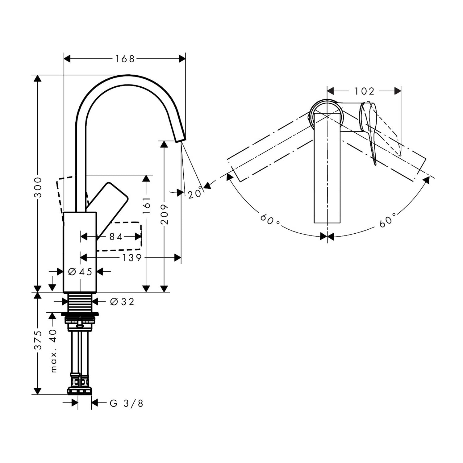 - Einfach eingebaut: Die Armatur wird über flexible Schläuche mit den Wasseranschlüssen verbunden (G3/8)
