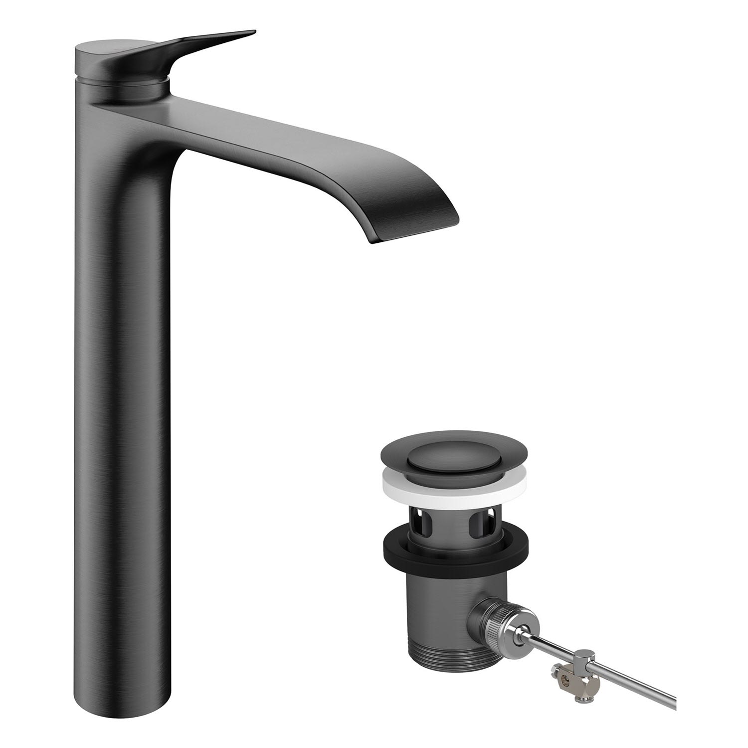 Der Vivenis Einhebel-Waschtischmischer 250 mit CoolStart und Zugstangen-Ablauf von hansgrohe beeindruckt durch seine harmonische Form und zaubert mit der Oberfläche in Brushed Black Chrome eine elegante Ästhetik ins Bad. Wie ein kleiner Wasserfall fließt der extra breite Wasserstrahl aus dem sanft geschwungenen Auslauf (WaterfallStream). Das bietet jeden Tag aufs Neue ein besonderes Erlebnis und schafft einen Ort der Erholung.
