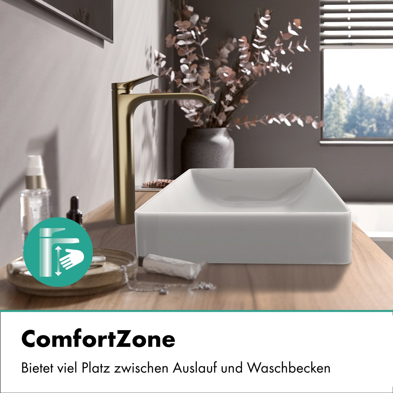 Der Vivenis Einhebel-Waschtischmischer 250 mit CoolStart von hansgrohe beeindruckt durch seine harmonische Form und zaubert mit der Oberfläche in Brushed Bronze eine elegante Ästhetik ins Bad. Wie ein kleiner Wasserfall fließt der extra breite Wasserstrahl aus dem sanft geschwungenen Auslauf (WaterfallStream). Das bietet jeden Tag aufs Neue ein besonderes Erlebnis und schafft einen Ort der Erholung.