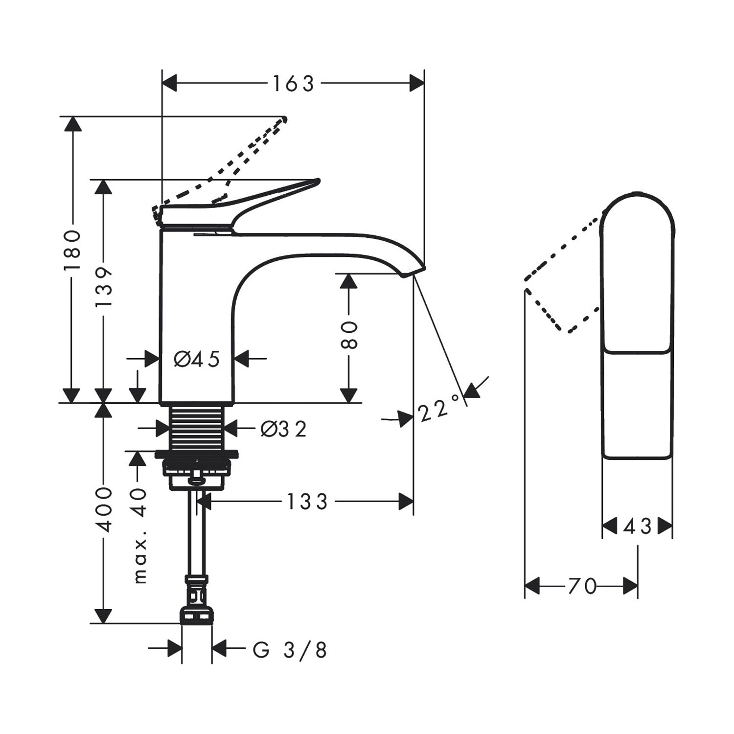 - Einfach eingebaut: Die Armatur wird über einen flexiblen Schlauch an ein Eckventil angeschlossen (Größe: G 3/8; DN15)